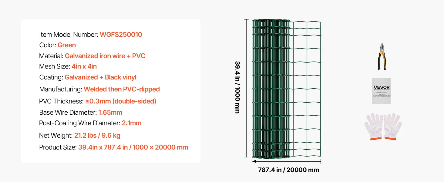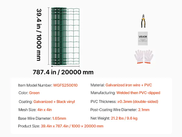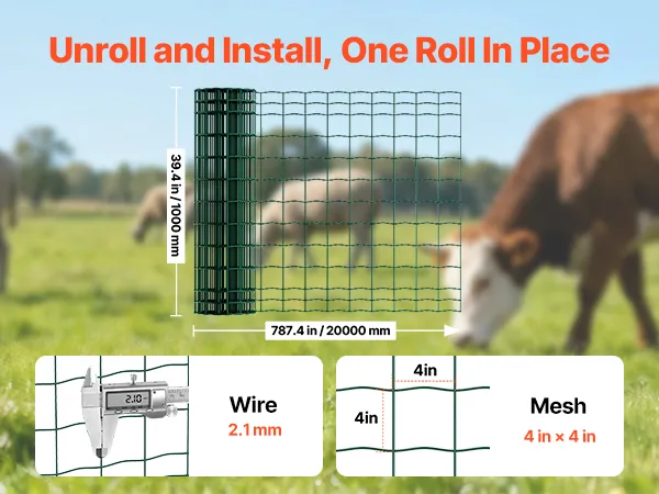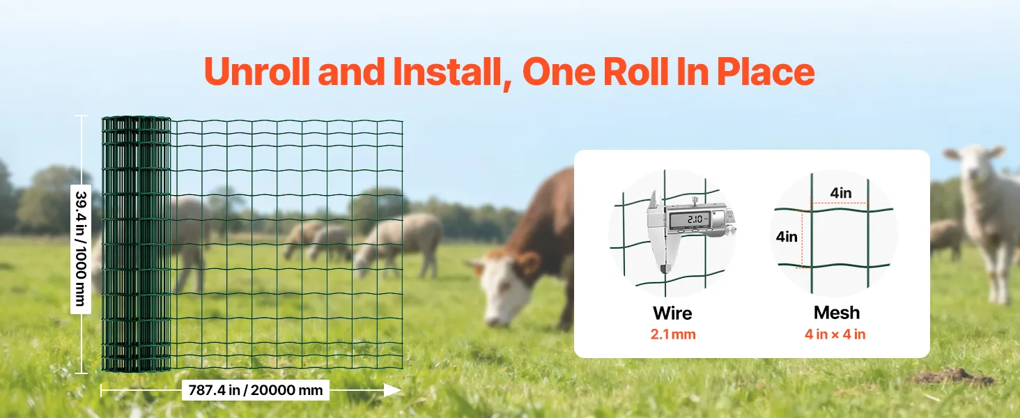 VEVOR Farm Fence, 1 x 20 m, 4 x 4 in Mesh 2.1mm Galvanized Steel Wire Fencing for Cattle, Hog & Sheep, Heavy Duty Vinyl Coated Livestock Fence for Animal Enclosures, Cage Wire, Garden Fences, Green