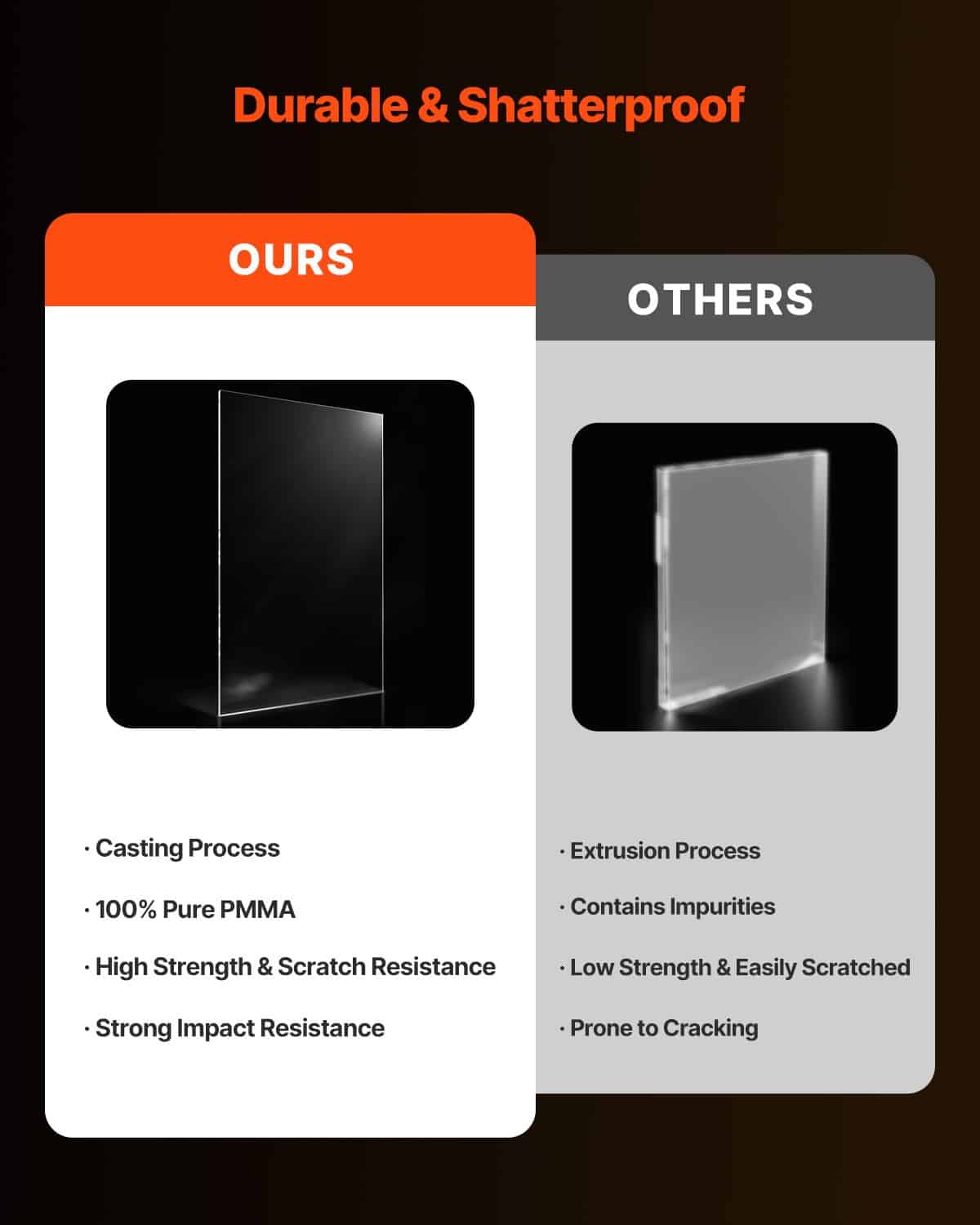 Эти пластиковые панели отличаются высокой прочностью и устойчивостью к ударам, поэтому их трудно разбить. На обеих сторонах имеются защитные пленки, которые необходимо снимать перед использованием, обеспечивая превосходную прозрачность высокой четкости.