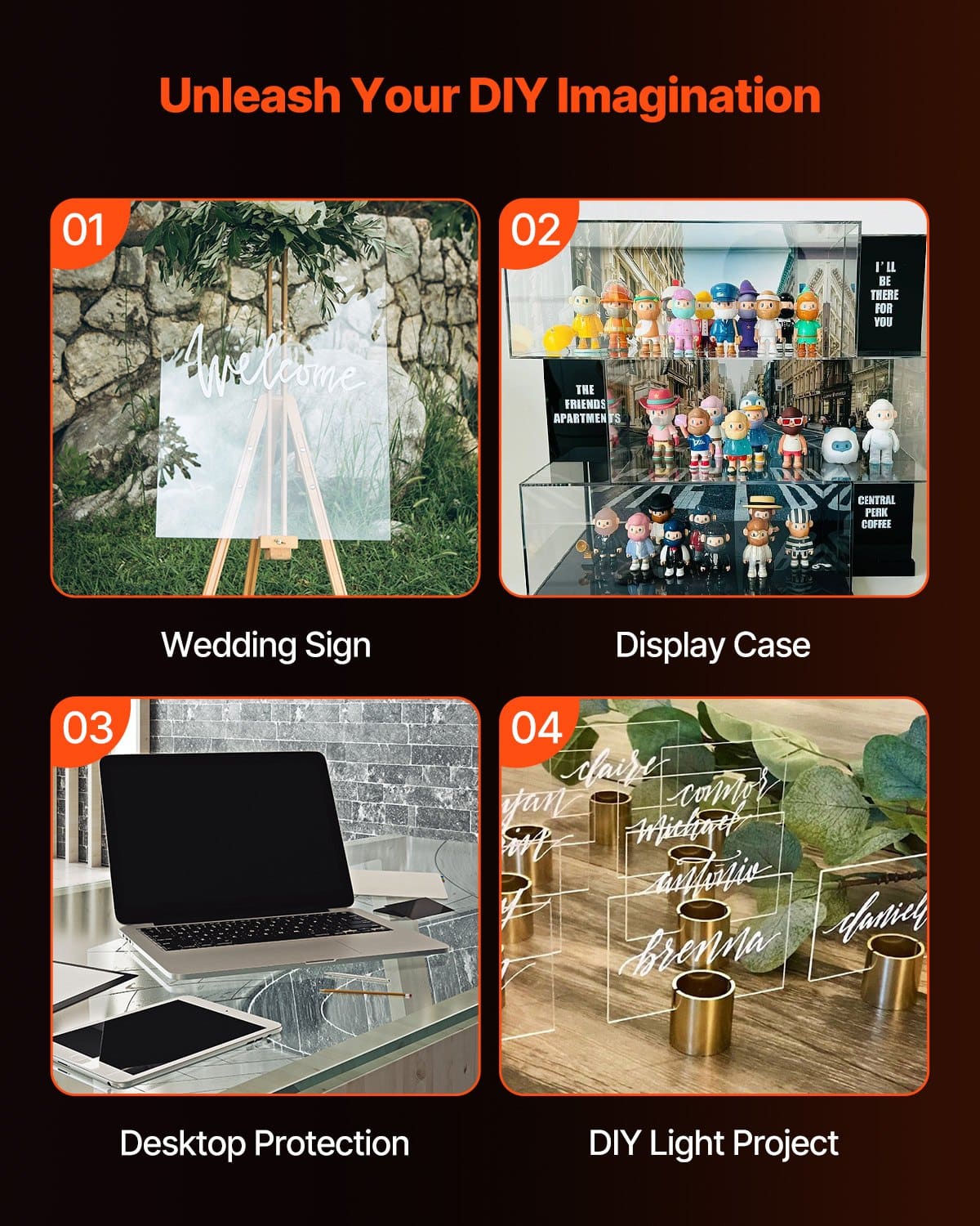 Каждый лист размером 24 x 48 дюймов, толщиной 1/8 дюйма (3 мм) изготовлен из высококачественного материала PMMA со 100% чистым MMA для превосходной прозрачности и прочности. Легко режется, сверлится или сгибается при нагревании, идеально подходит для поделок своими руками, свадебных вывесок, мебельных полок, защитных барьеров и многого другого!