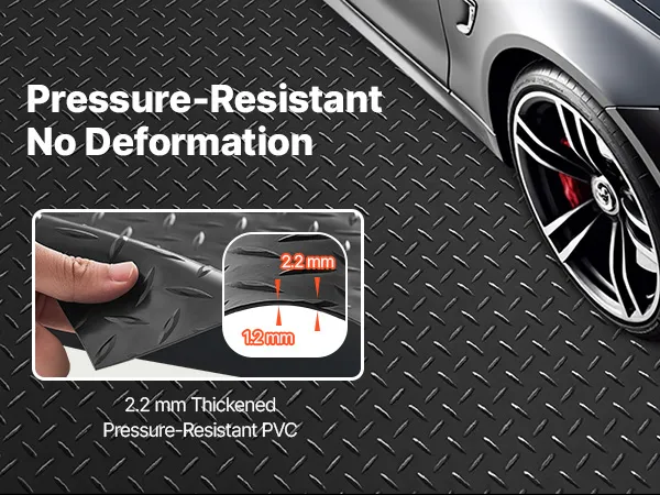 • Heavy-Duty PVC: This garage flooring mat is made of 2.2 mm thick heavy-duty PVC, providing excellent wear and pressure-resistance. It withstands trailers, trucks, and heavy vehicles without deformation, ensuring long-lasting use