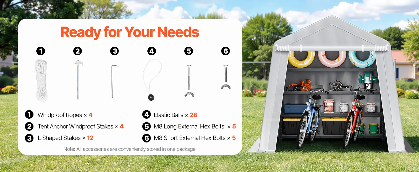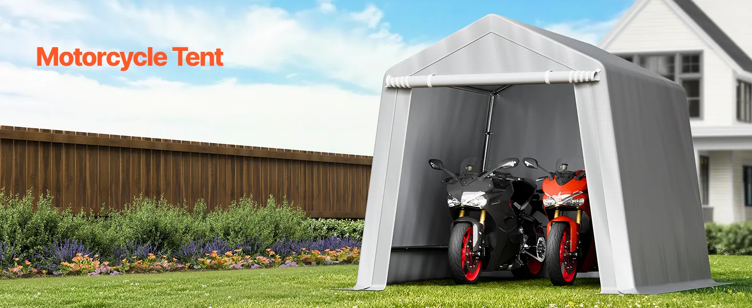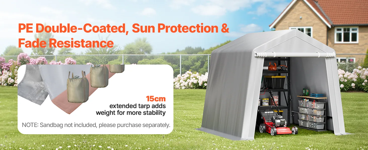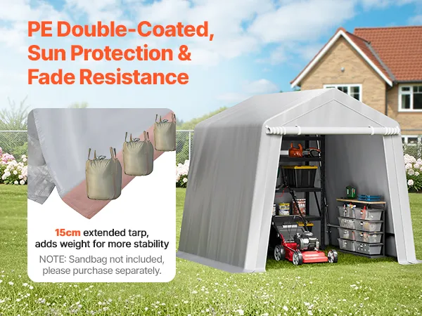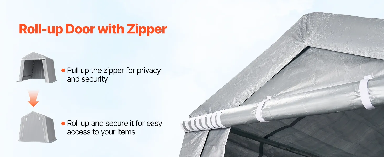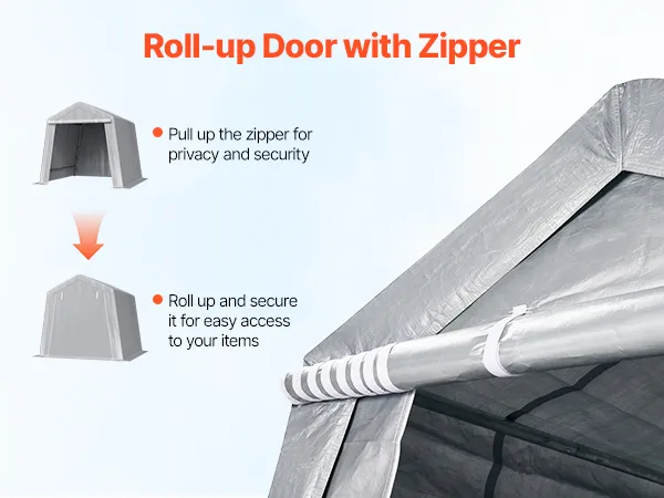 Этот сарай для хранения построен из оцинкованных стальных труб диаметром 38 мм и оснащен навесом из полиэтилена с двусторонним покрытием для защиты от солнца и выцветания, обеспечивающим безопасное хранение в любую погоду. Откидная дверца на молнии обеспечивает конфиденциальность и удобство. Идеально подходит для мотоциклов, садовых инструментов и общего хранения на открытом воздухе.