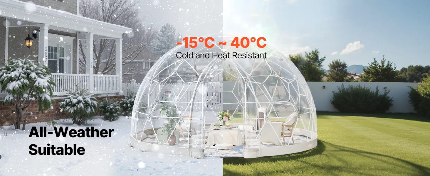 A1: This dome tent is designed for all-season use. The 0.3mm thick cold-resistant PVC cover and windproof frame to withstand temperatures (5°F to 104°F), for excellent insulation and protection. For winter use, we recommend placing a heater inside.