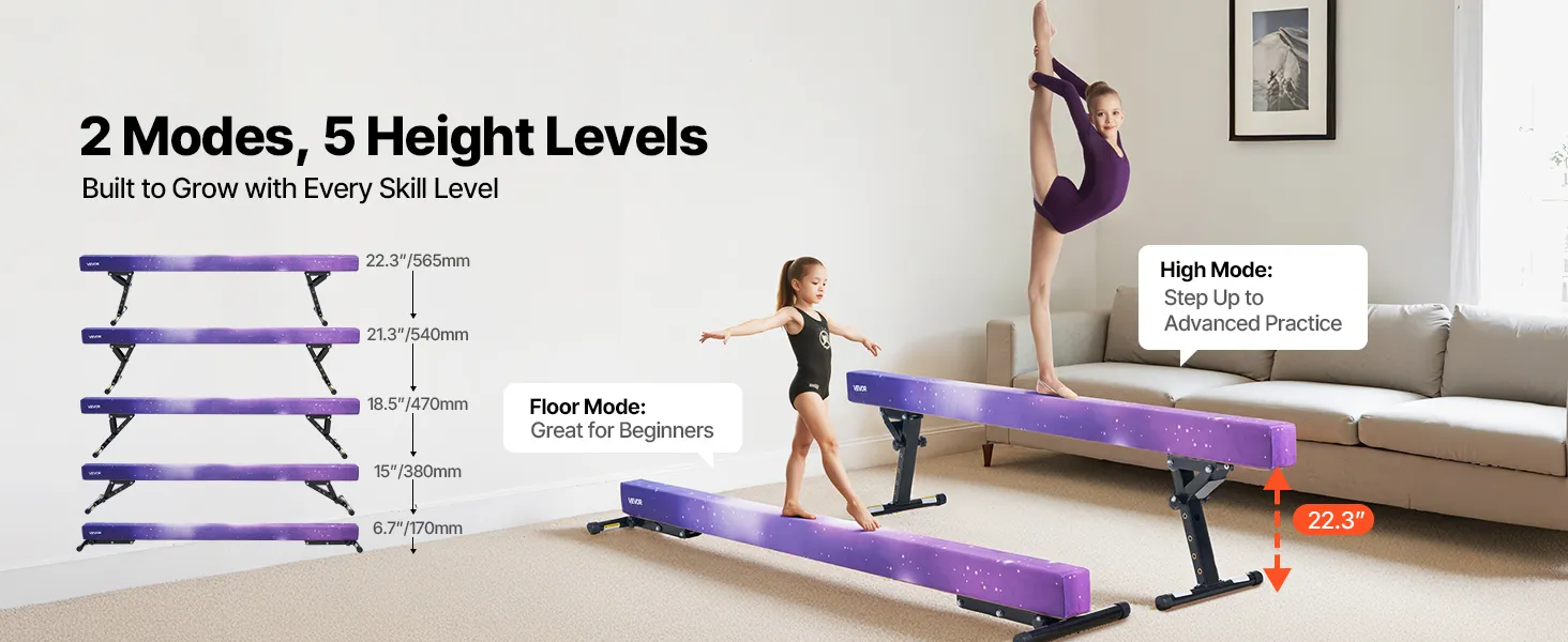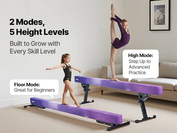 • 5 Height Levels & 2 Modes: This 8 ft adjustable balance beam features two training modes: a floor mode for beginners and a raised mode for advanced practice. The height can be adjusted from 6.7 in up to 15 / 18.5 / 21.3 / 22.3 inch