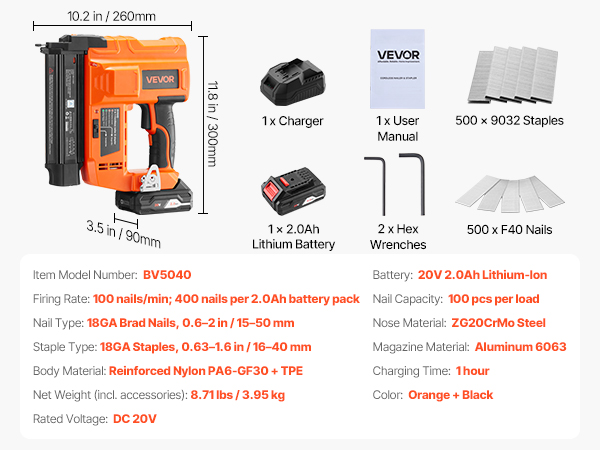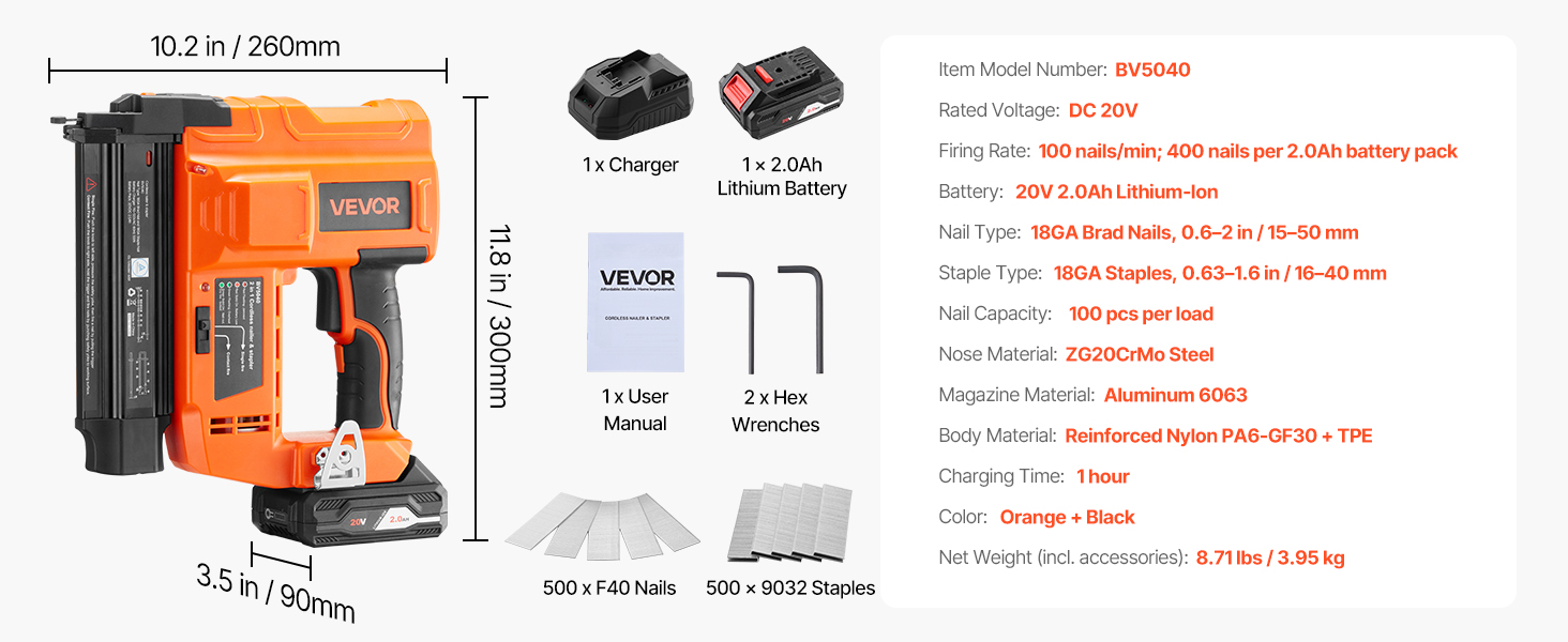 VEVOR 2-in-1 Cordless Brad Nailer, 18 Gauge, 20V Battery Powered Nail Gun and Staple Gun, with 500 pcs Nails, 500 pcs Staples, 2.0 Ah Li-ion Battery and Charger, for Home Improvement, Woodworking