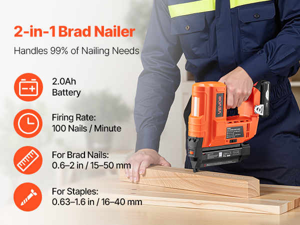 The cordless brad nailer is compatible with 0.6–2.2 in (15–55 mm) brad nails and 0.6–1.6 in (16–40 mm) staples. It handles fastening and decoration needs with ease.