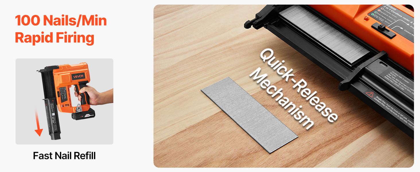 Our battery powered nail gun supports up to 100 nails/min firing rate, suitable for large projects requiring both speed and precision. Its continuous firing mode ensures smooth, uninterrupted performance.