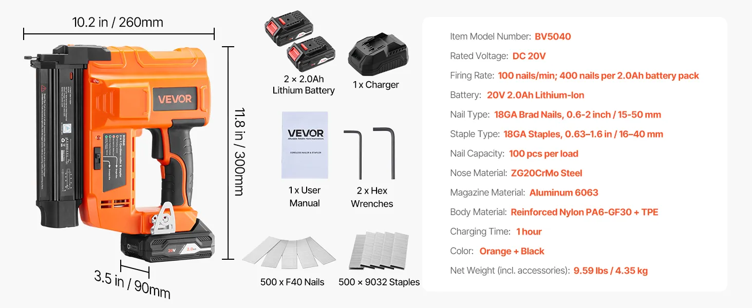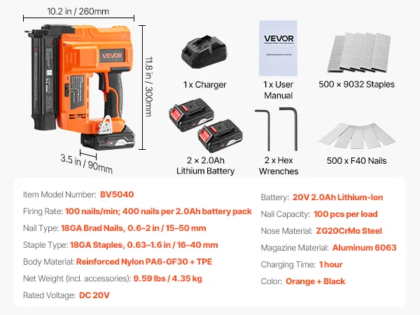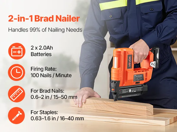 VEVOR 2-in-1 Cordless Brad Nailer, 18 Gauge, 20V Battery Powered Nail Gun and Staple Gun, with 500 pcs Nails, 500 pcs Staples, 2 x 2.0 Ah Li-ion Batteries, Charger, for Home Improvement, Woodworking