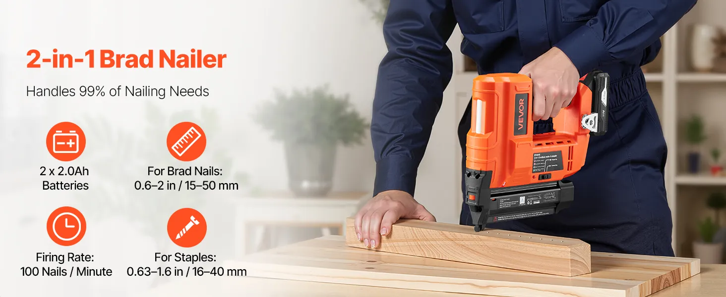 The cordless brad nailer is compatible with 0.6–2.2 in (15–55 mm) brad nails and 0.6–1.6 in (16–40 mm) staples. It handles fastening and decoration needs with ease.