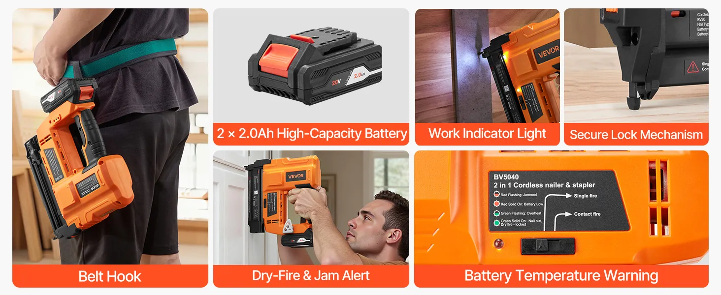 Equipped with a security lock, dry-fire protection, a visible work indicator light, and a jam warning system, this cordless nail gun resists accidental firing and tool damage. Every detail is designed to safeguard you and your workspace.