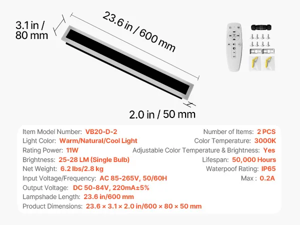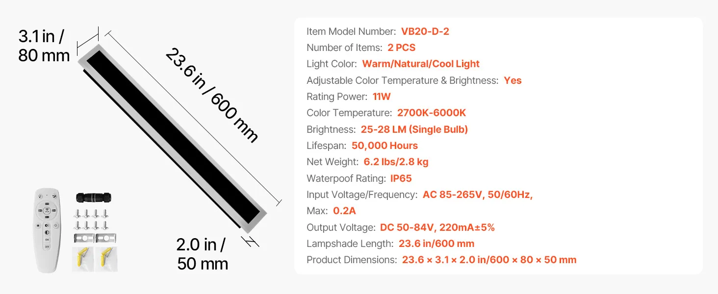 VEVOR Outdoor Wall Lights, 2 Pack, 600 mm Long Strip Modern Exterior Wall Sconce Light Fixtures, 2700K-6000K, IP65 Waterproof Anti-Rust, Dimmable Outside Wall Mount Lighting, for House Porch Garage