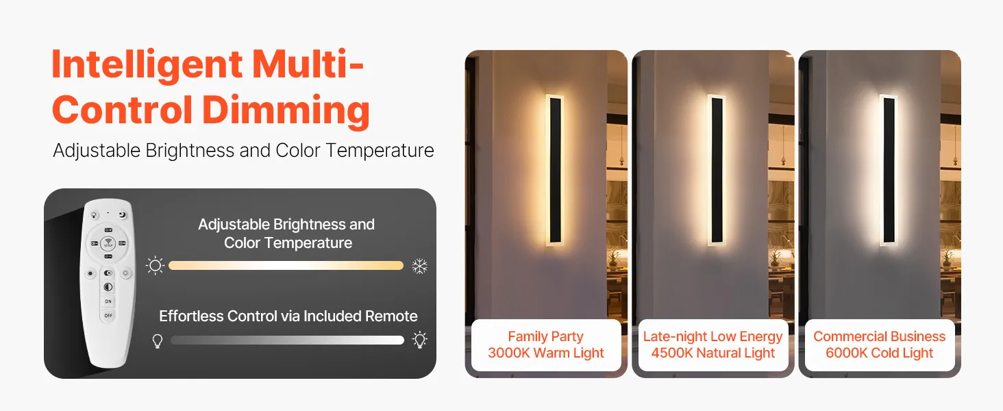 Multi-directional soft light creates ambient moods, IP65 waterproof ensures durability for outdoor use, and is equipped with a remote control for smart dimming. This energy-efficient outdoor wall light with extended lifespan is ideal for gardens, entryways, and commercial facades.