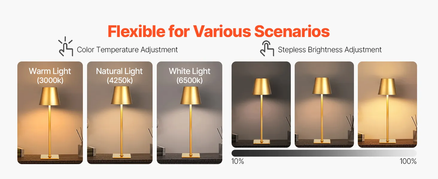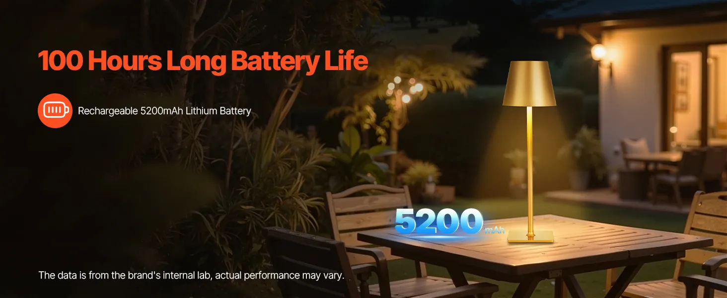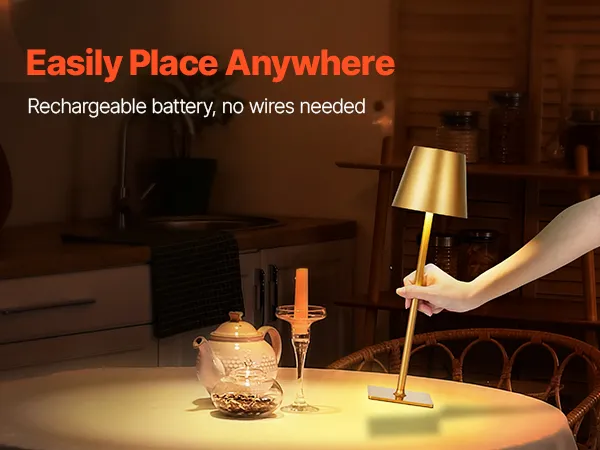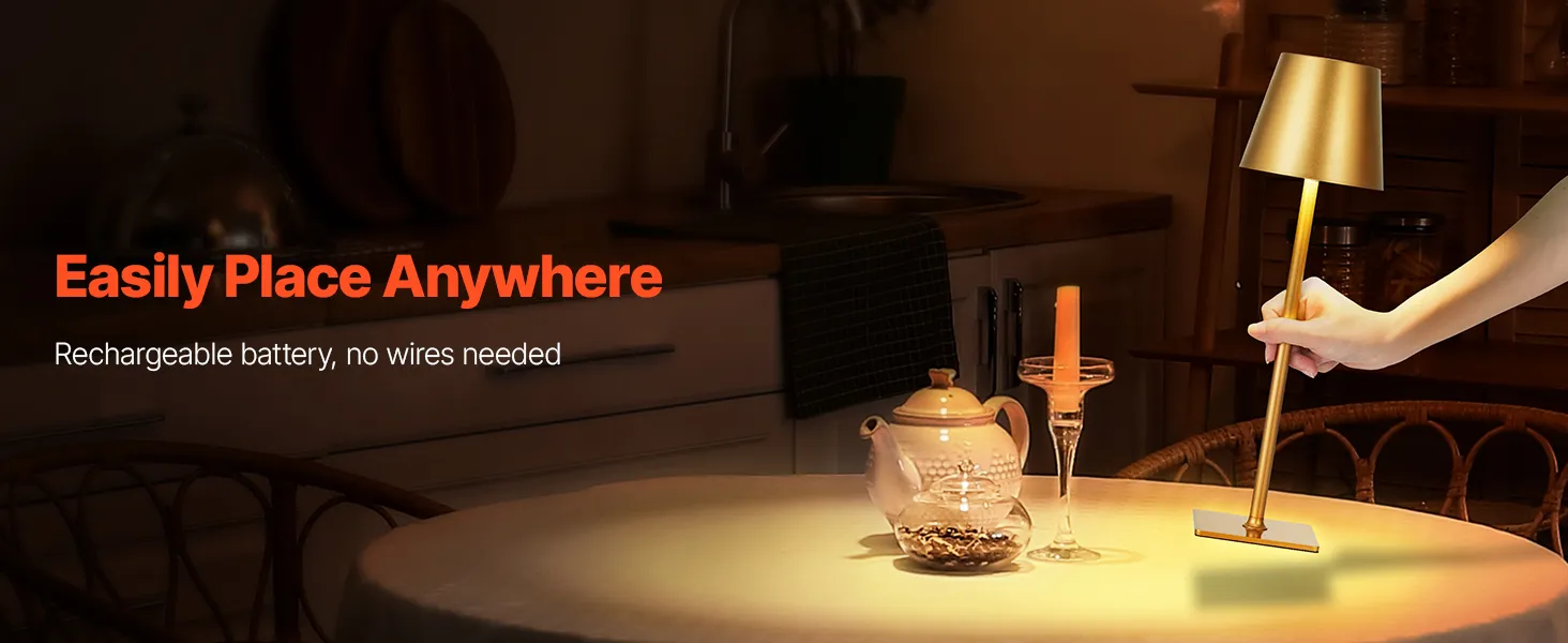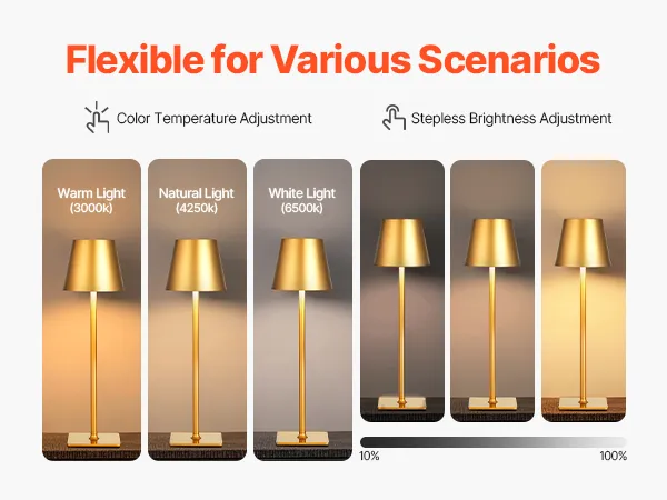 This cordless table lamp is built for convenience and comfort. It provides long-lasting power to meet your lighting needs for reading, work, or outdoor activities. The stepless dimming design easily adapts to any scene, from soft ambiance to bright reading light with a single touch.