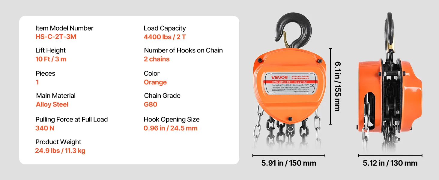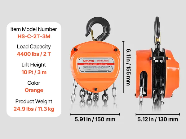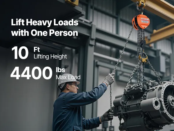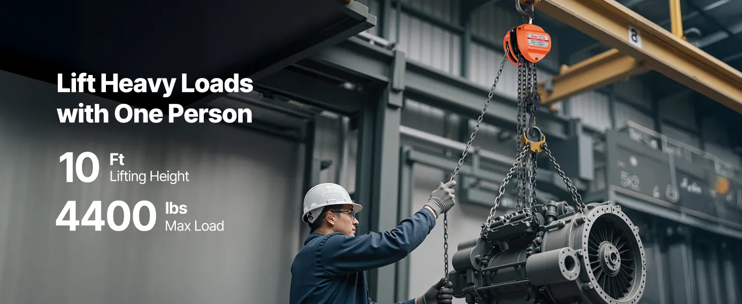 • 4400 lbs Heavy Duty Capacity: This hand chain hoist easily handles heavy lifting tasks, supporting up to 4400 lbs (2 T) and reaching heights up to 10 ft (3 m). Ideal for garages, construction sites, and warehouses