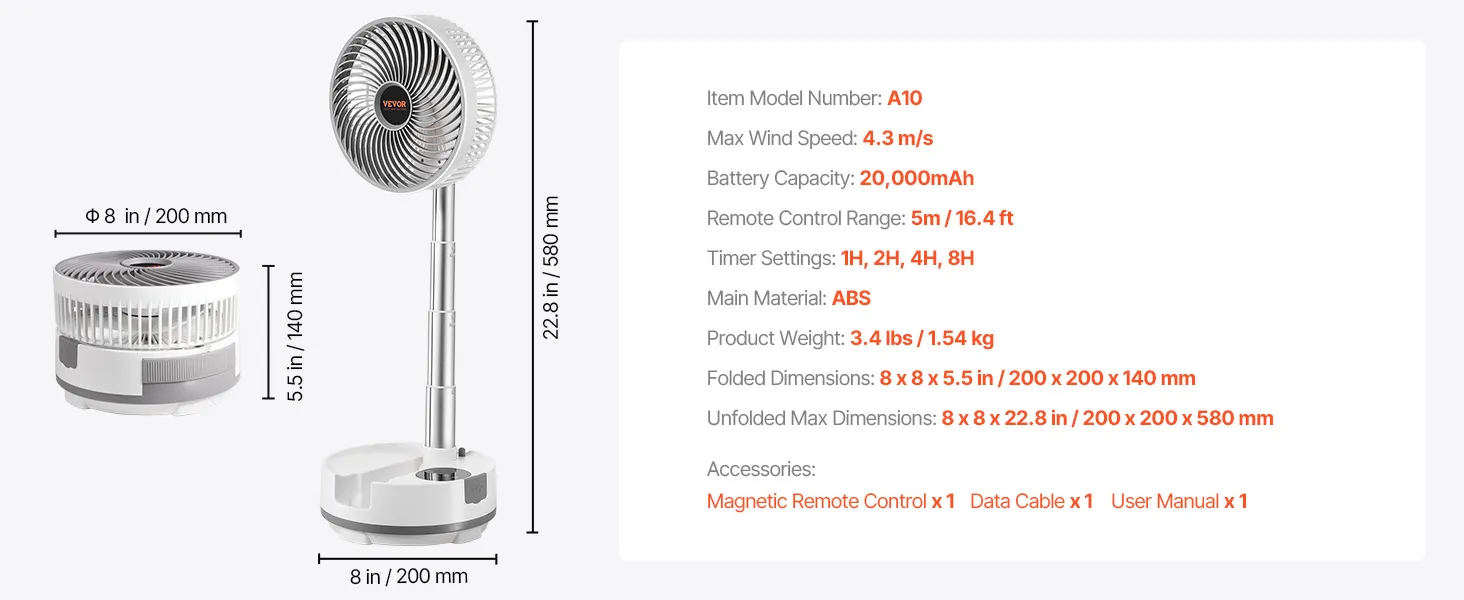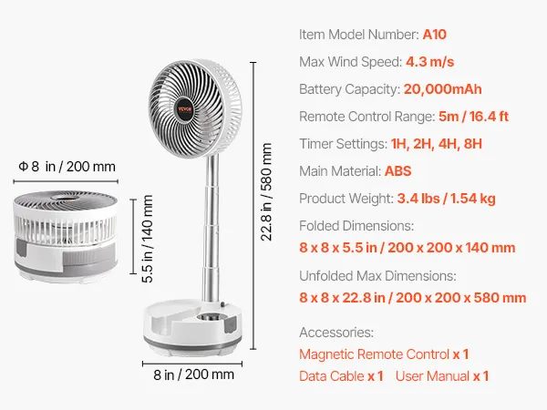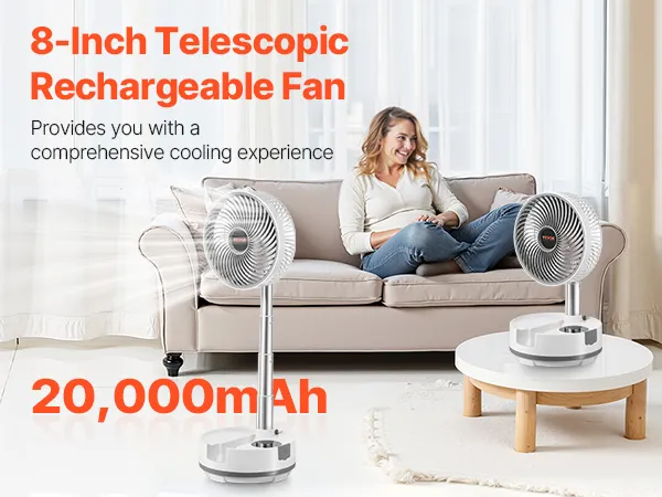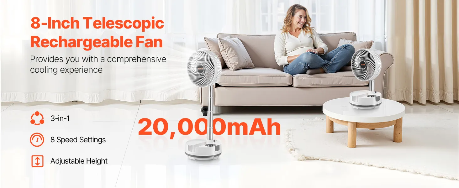 VEVOR 20,3 см складной перезаряжаемый колеблющийся вентилятор, 8 скоростей, аккумулятор 20000мАч, пульт, регулируемая высота, для дома и улицы