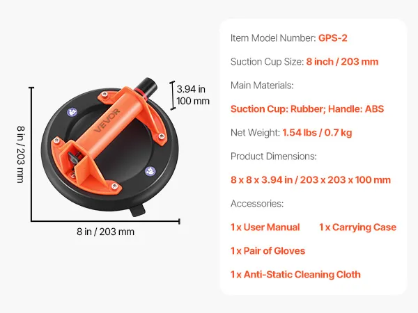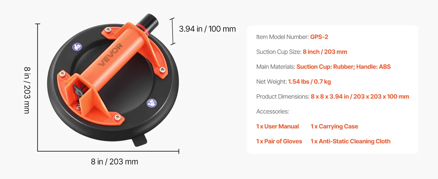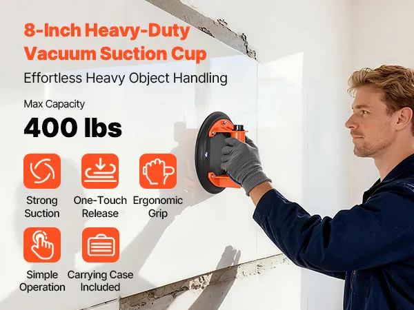 VEVOR Vacuum Suction Cup, 203 mm Vacuum Glass Lifter with ABS Handle, 180 kg Max Lifting Capacity Tile Suction Cup Tool with Carrying Case for Lifting Large Tile, Granite, Drywall, Windows (1-Pack)
