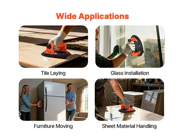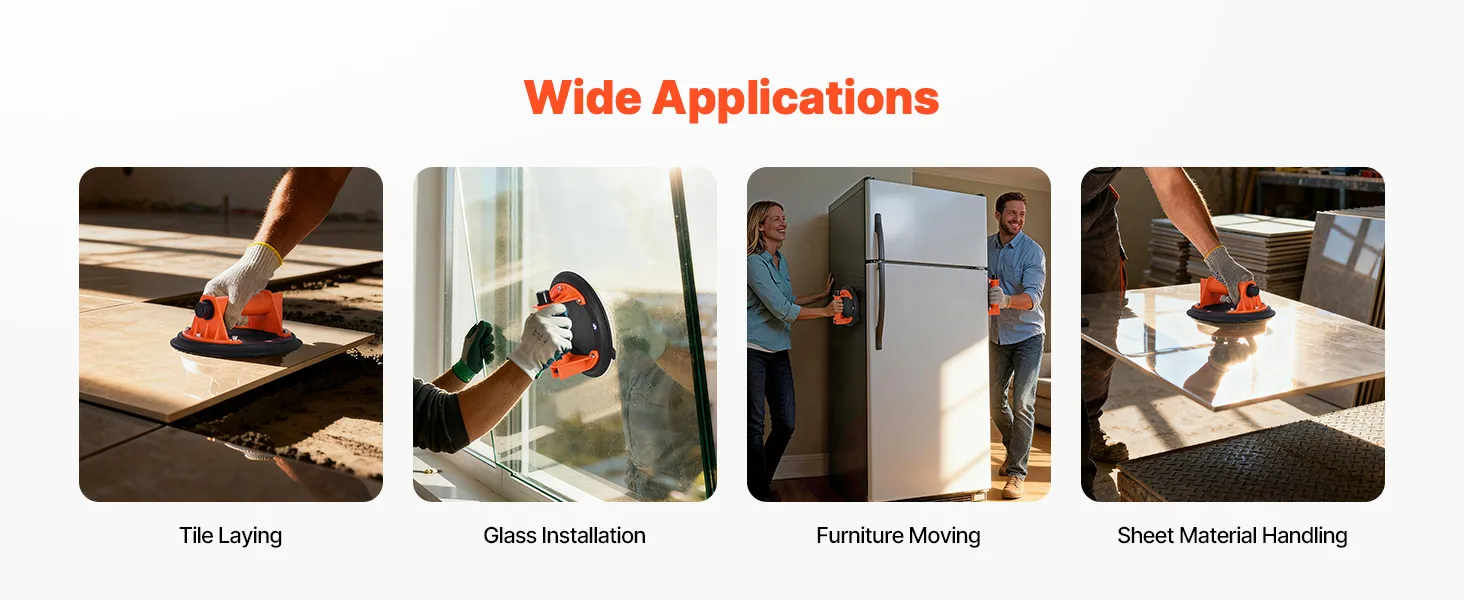 The vacuum lifter shines in big-tile laying, glass handling, door and window installs, and moving tasks. The tool suits home renovation and industrial work alike.
