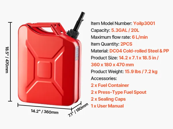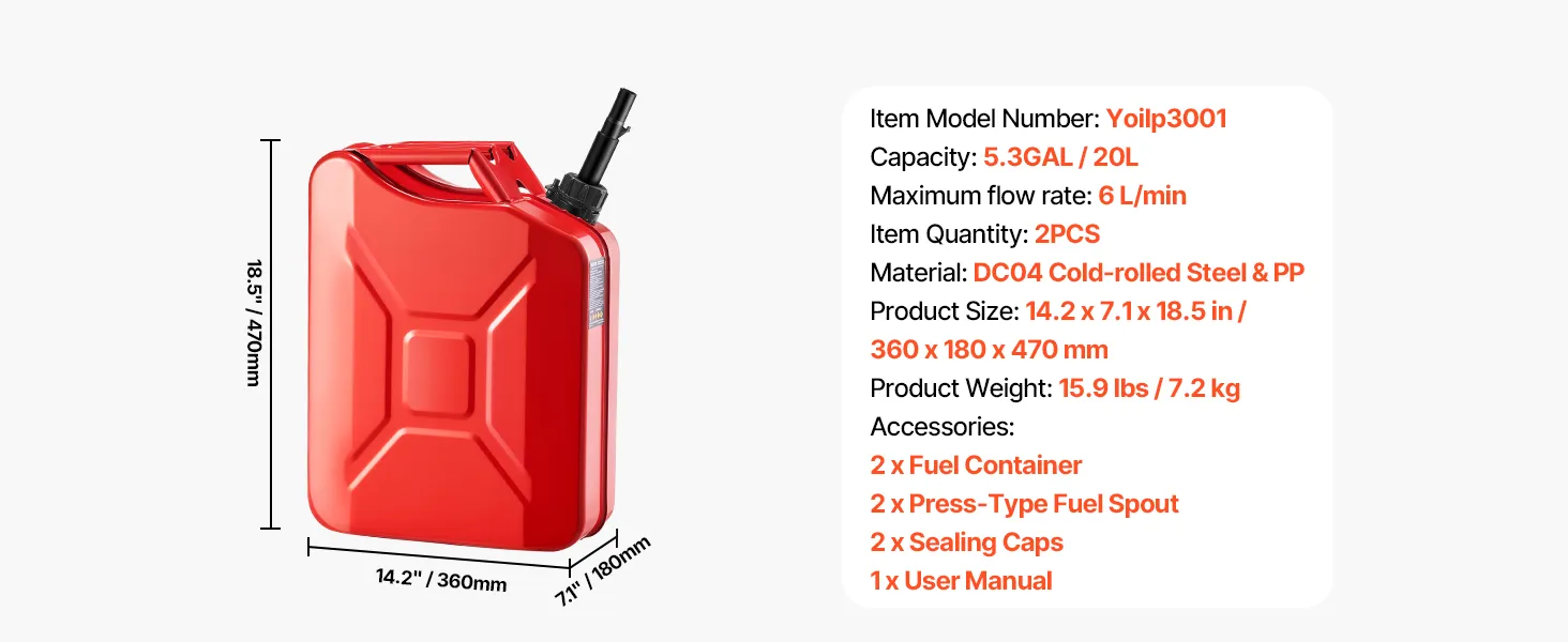 • Compact Size: Need extra fuel on the go? This 5.3Gal/20L metal gas can (14.2 x 7.1 x 20.1 inches) slips into your trunk with ease. Lightweight yet practical, it’s ideal for road trips, camping, or outdoor work