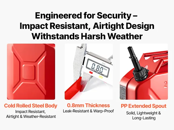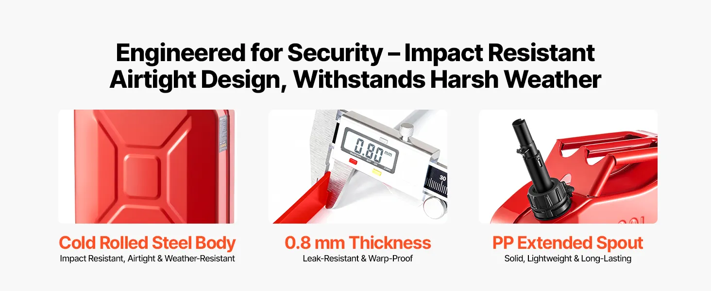 • Military-Style Durable Build: Looking for tough? This fuel jerry can uses 0.8 mm cold-rolled steel that withstands drops, bumps, and sun. A PP extension spout makes every refill easy and clean