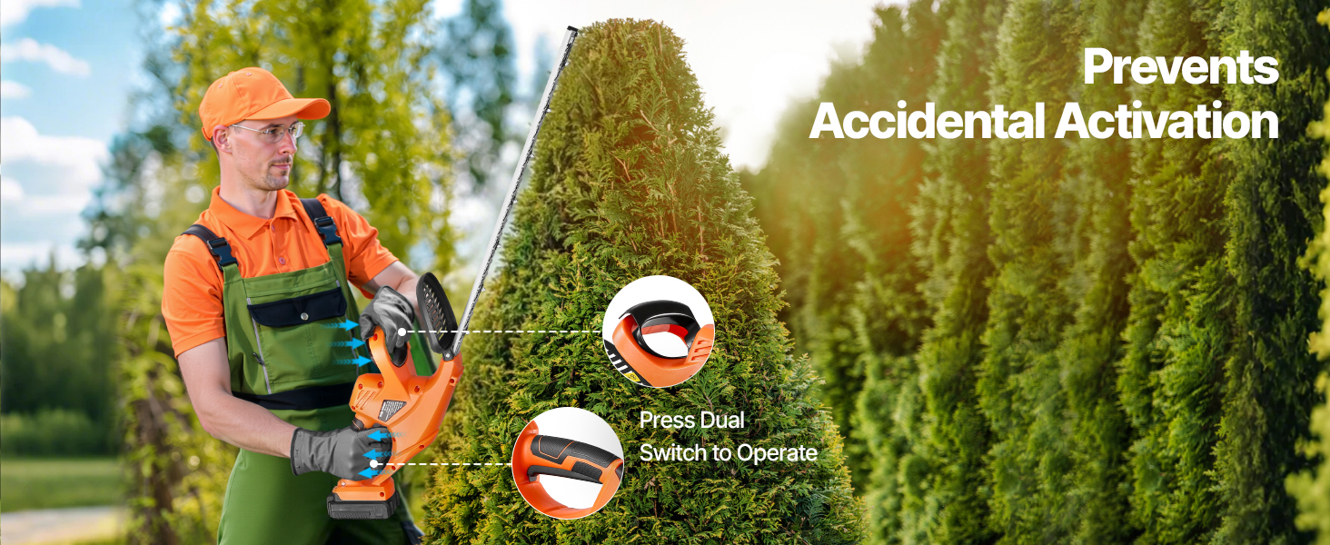 Оснащенный функциями двойной защиты и скользящим кожухом лезвия, наш аккумуляторный триммер для кустарников предотвращает травмы и повышает безопасность, придавая вам уверенности при обрезке и позволяя беззаботно наслаждаться работой в саду.