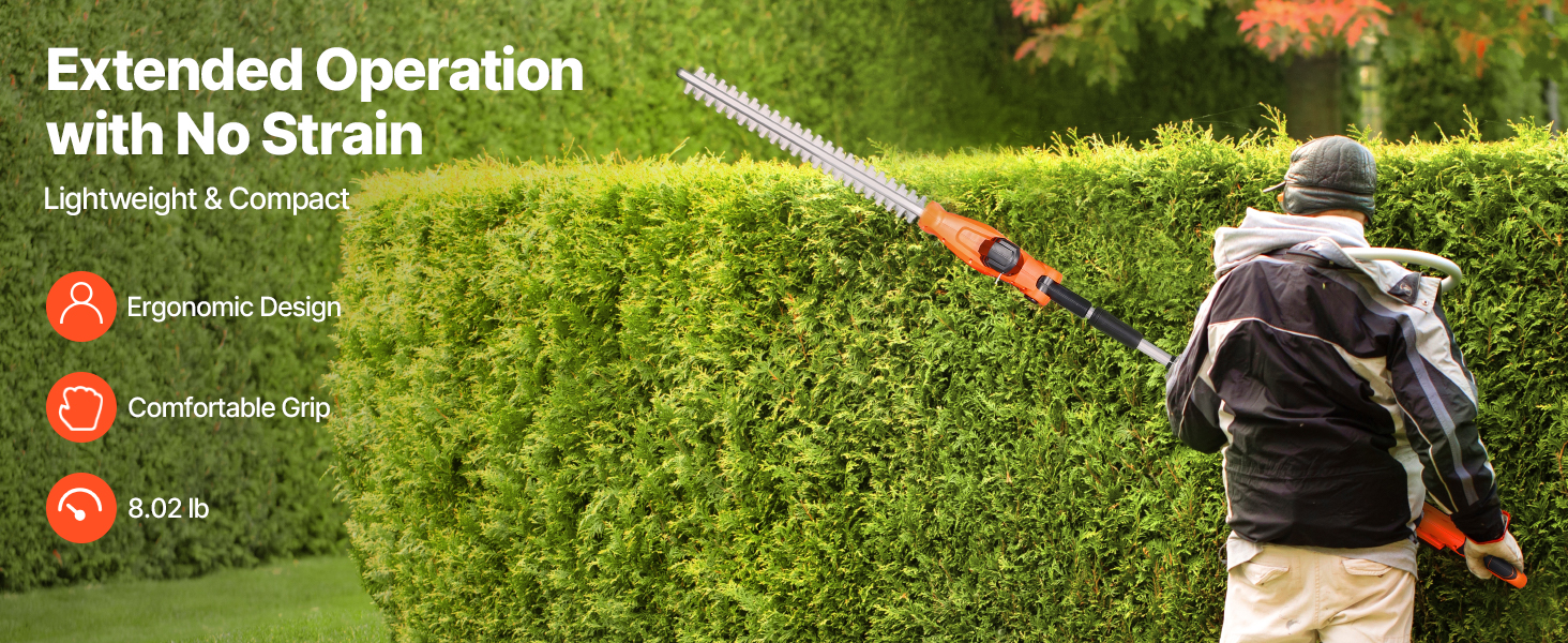 Наслаждайтесь многочасовой стрижкой с легкостью! Этот аккумуляторный триммер для живой изгороди, разработанный с учетом эргономики и весящий всего 8,02 фунта, делает любую садовую задачу управляемой и избавляет от стрессов, помогая вам создать свой идеальный сад.