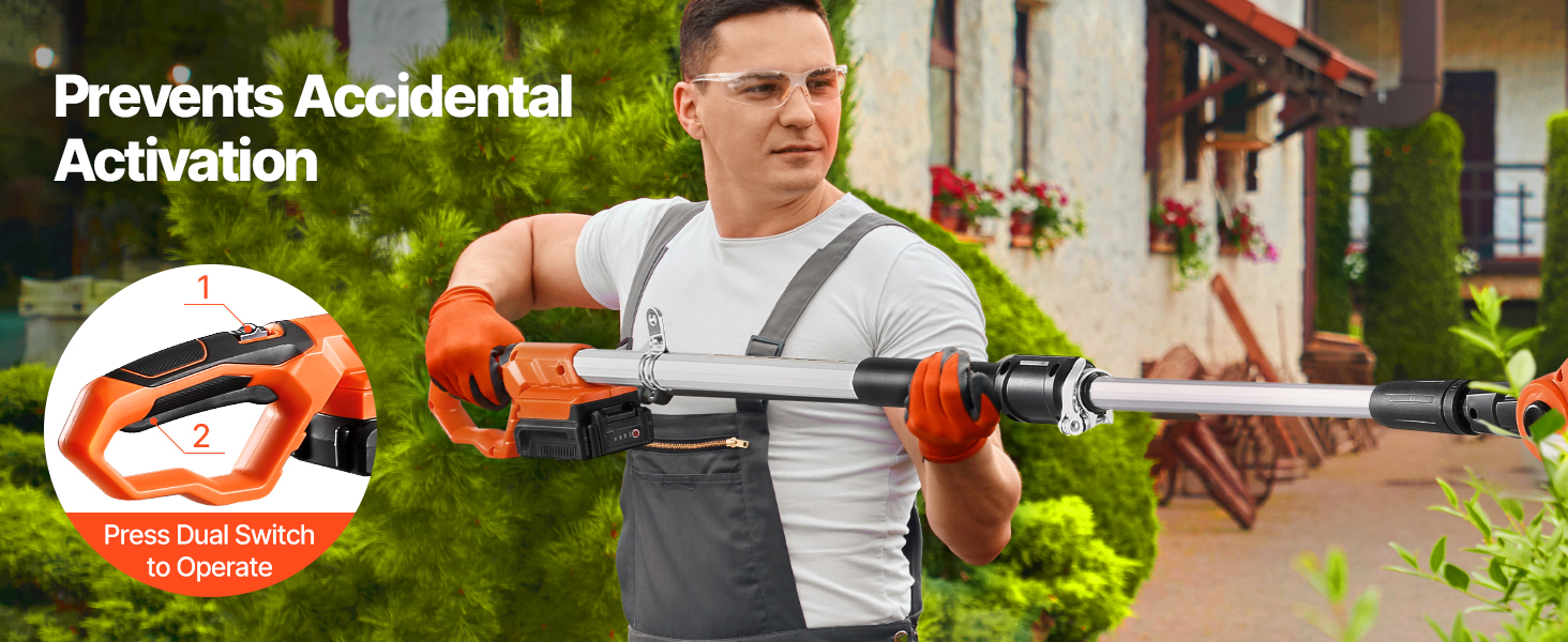 Чувствуйте себя в безопасности благодаря конструкции с двойной защитой и скользящему кожуху лезвия. Благодаря регулируемой длине лезвия вы избежите травм, что придаст вам уверенности при каждой обрезке и сделает работу в саду более приятной.