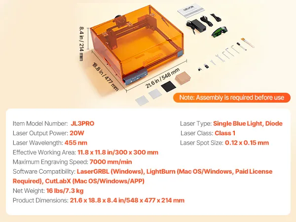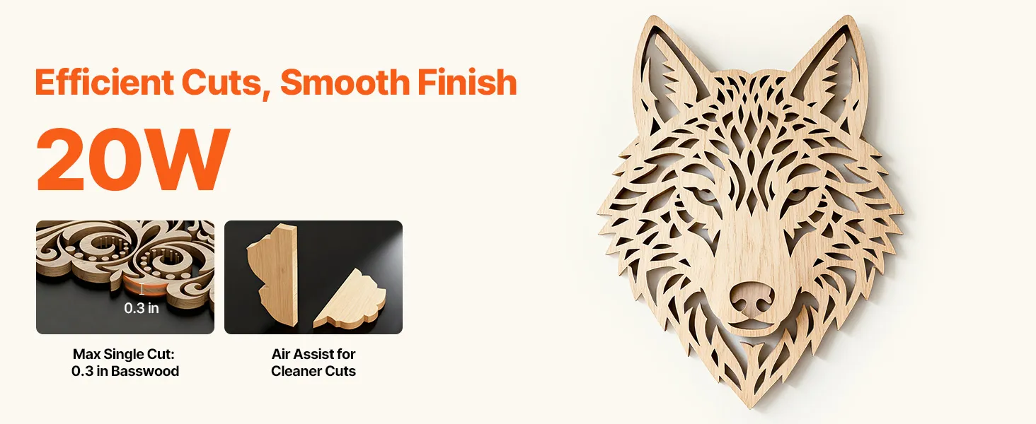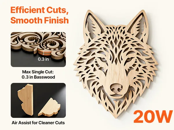 • Outstanding Productivity: Laser Class: Class 1, Power Output: 20000mW. With speeds up to 7,000 mm/min and an 11.8 x 11.8 in working area, this wood laser engraver cuts through 0.3 in basswood in a single pass, as easily as slicing butter