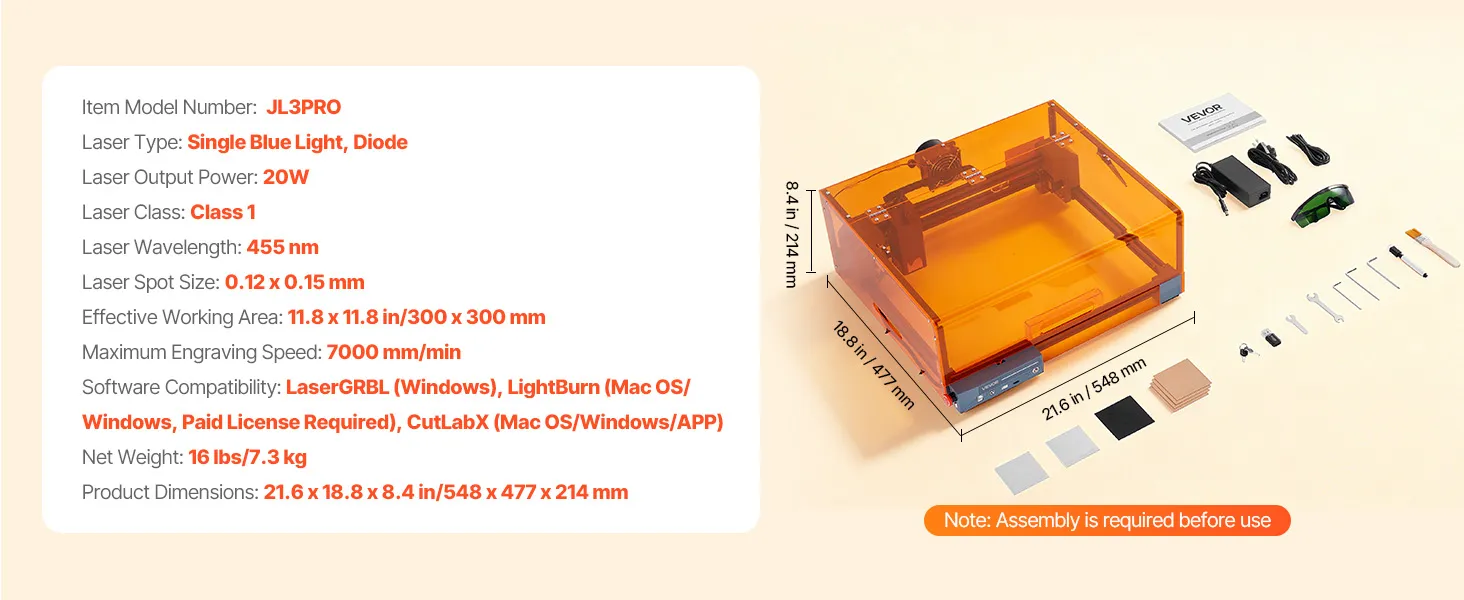 VEVOR 20W Class 1 Laser Engraver with Enclosure, 300×300 mm Area, 7000 mm/min Speed for Wood, Leather, Glass, Metal