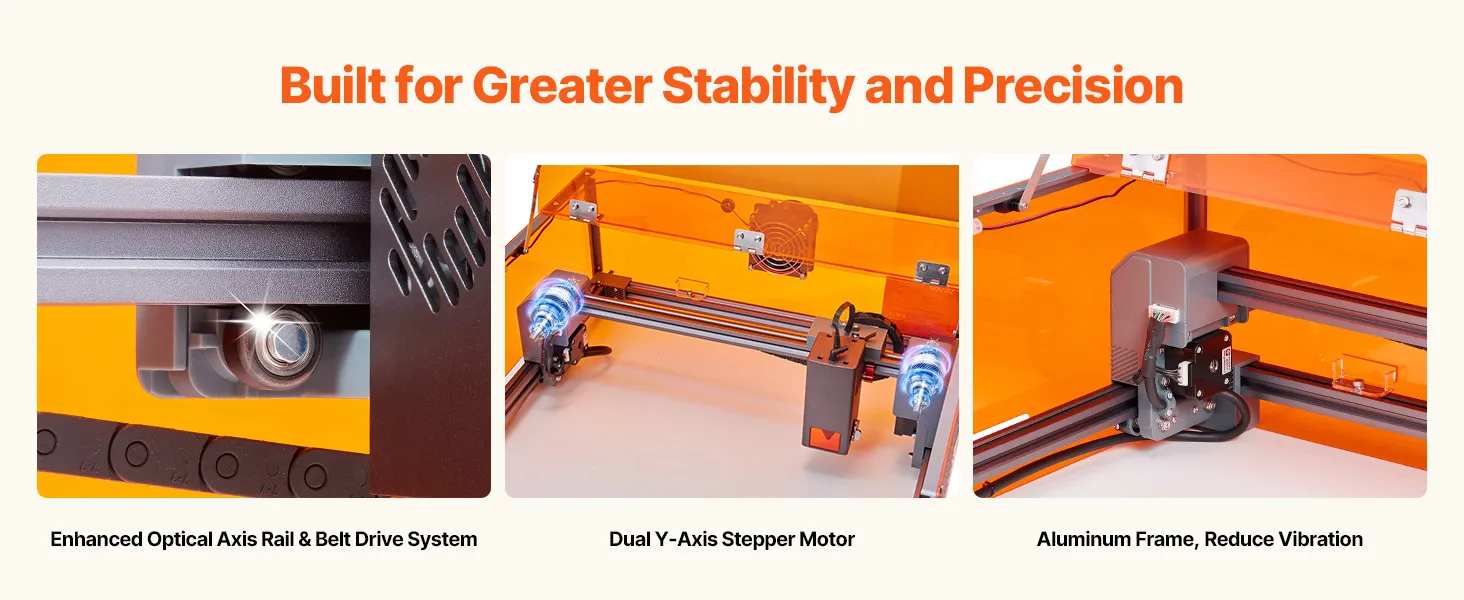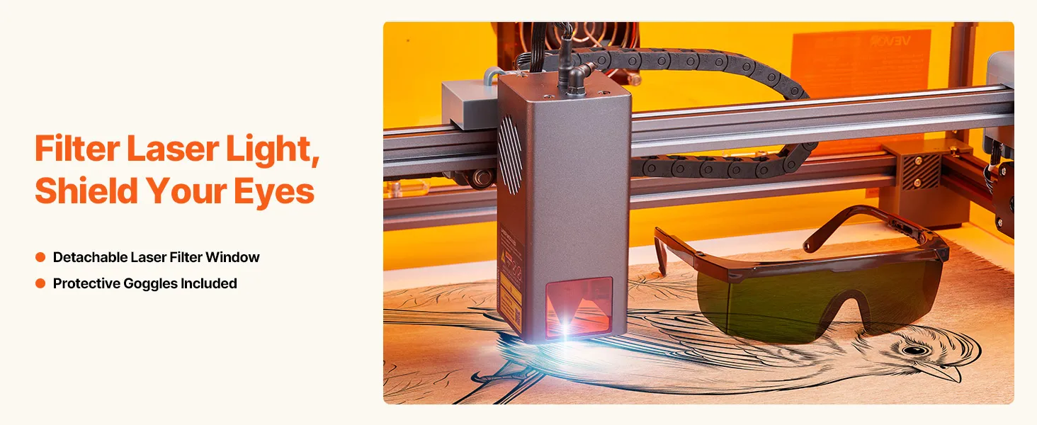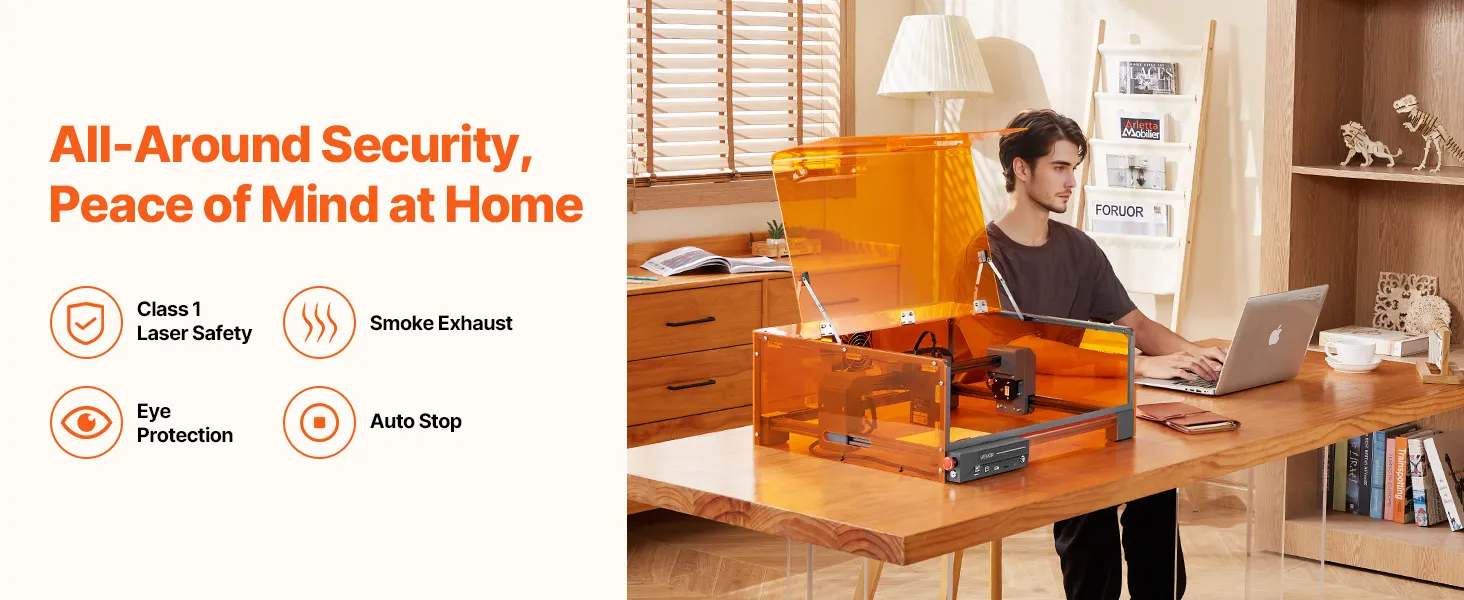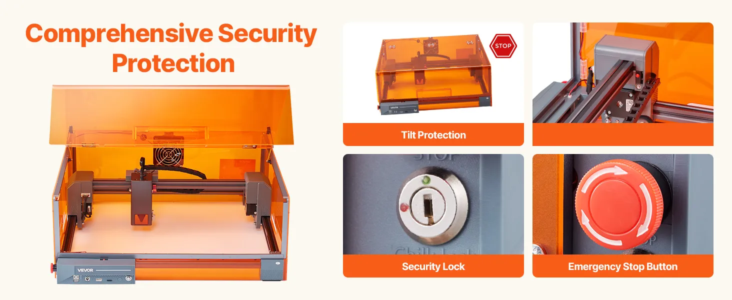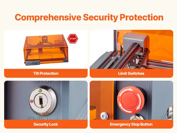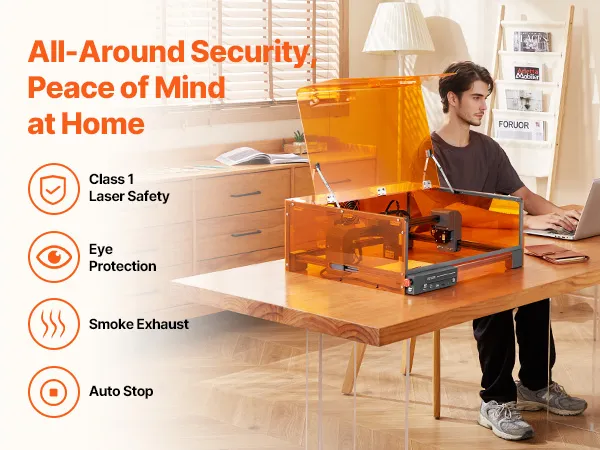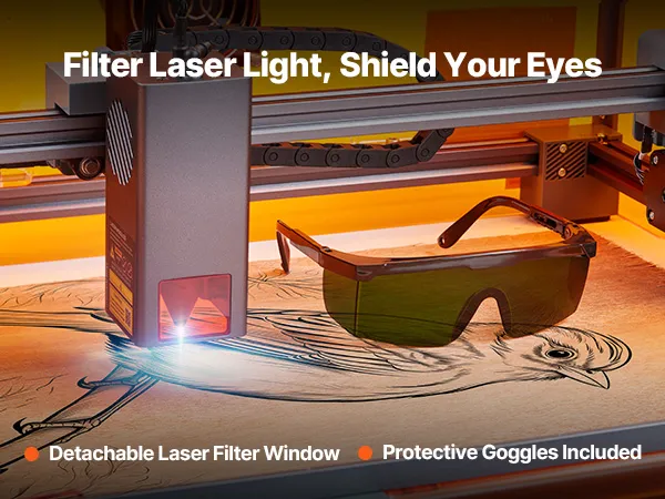 • Class 1 Safety Protection: Engrave confidently with a protective enclosure that filters laser light, blocks smoke, and noise. Our laser cutter and engraver provides all-around security with an emergency stop, tilt stop, limit switches, security lock, etc