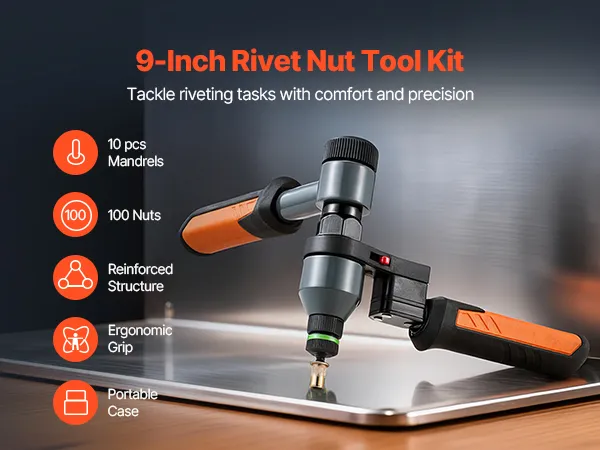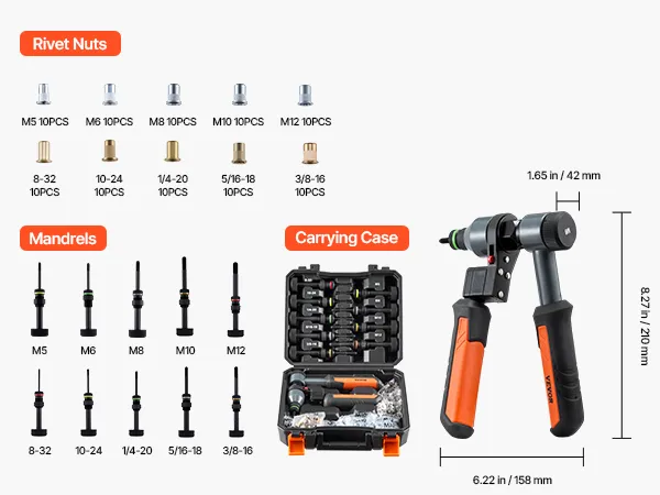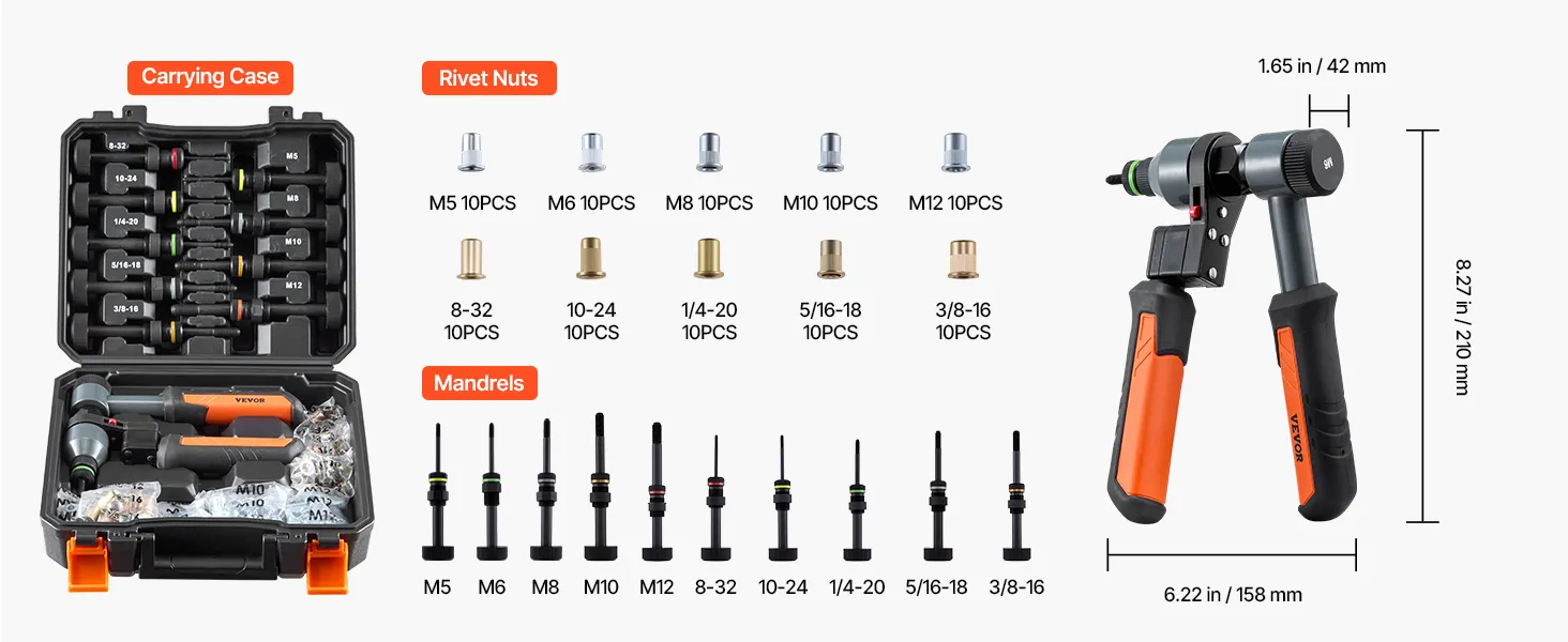 VEVOR Rivet Nut Tool Kit, 210 mm Ratchet Rivnut Tool Kit, with 10 Mandrels and 100 Nuts, Metric and SAE Size M5, M6, M8, M10, M12, 8-32, 10-24, 1/4-20, 5/16-18, 3/8-16 UNC, with a Rugged Carrying Case