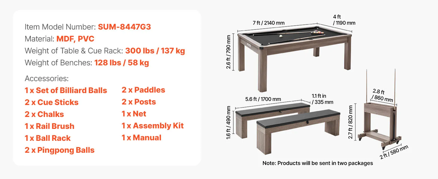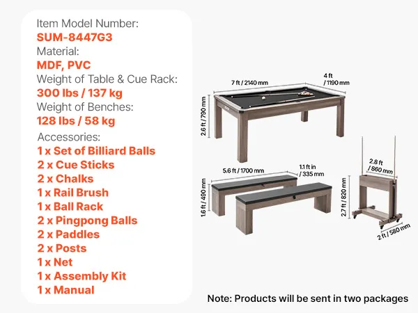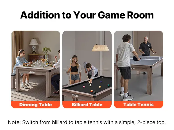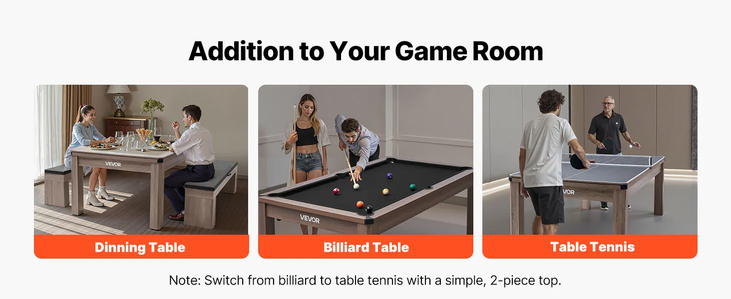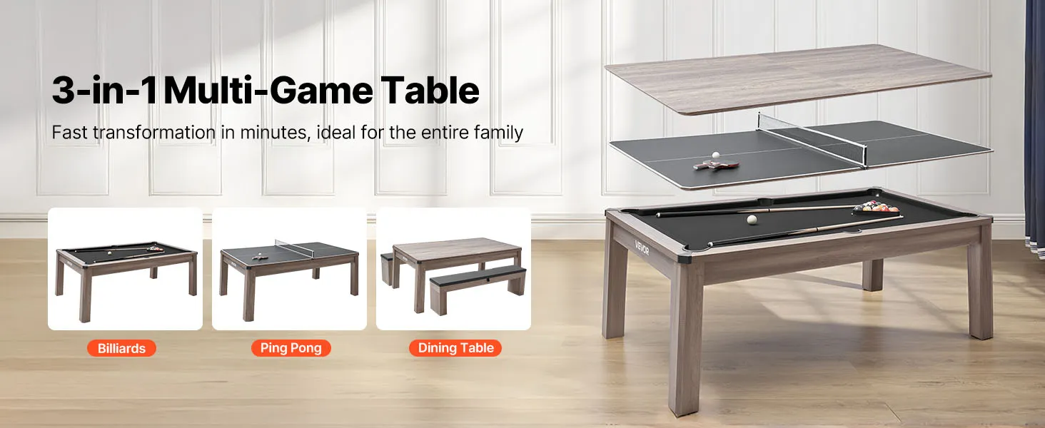 VEVOR 214cm Pool Table Combo Set, 3-in-1 Multi Game Billiards Tables with Dining Top and Ping Pong, 2 Benches for Storage and Accessory, Includes Ball Cue Rack Chalk Brush, for Family Recreation Room