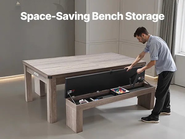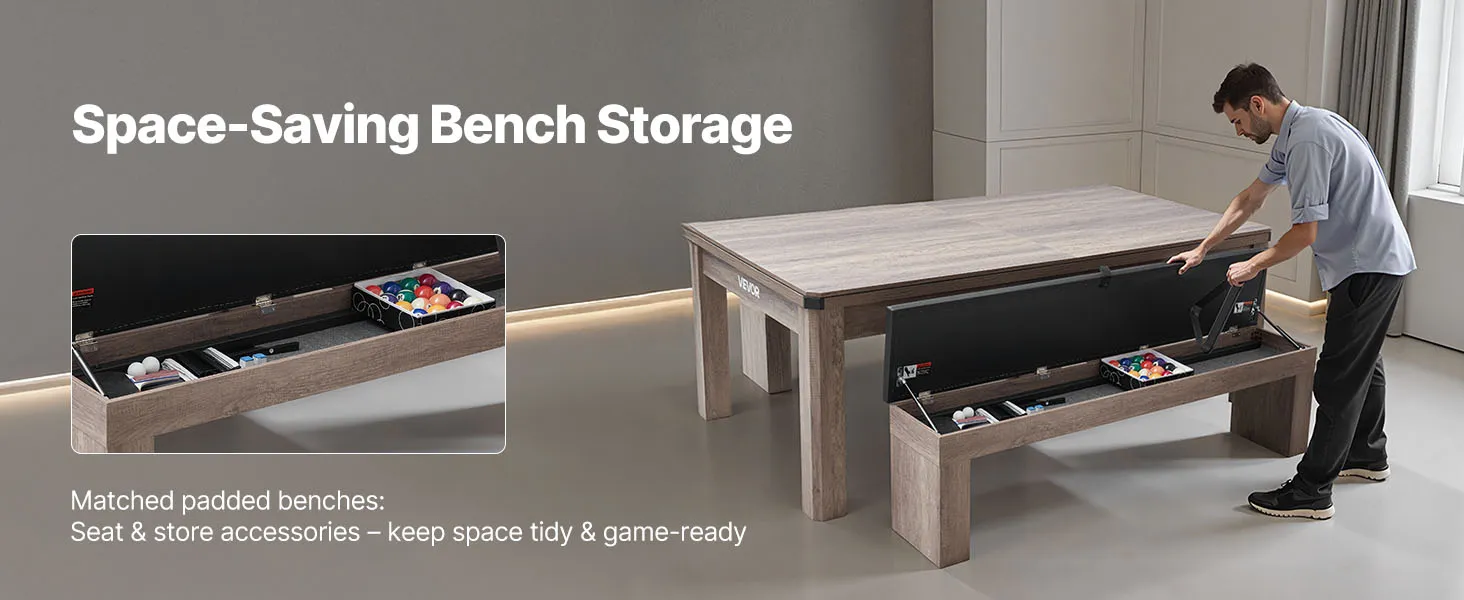 Storage benches of this pool table combine seating and hidden storage to maximize small-space efficiency.