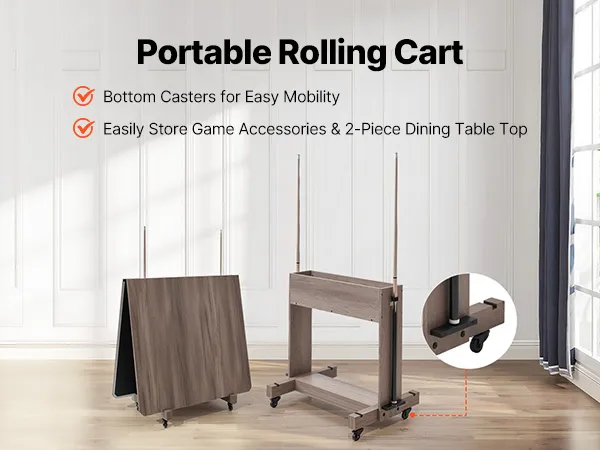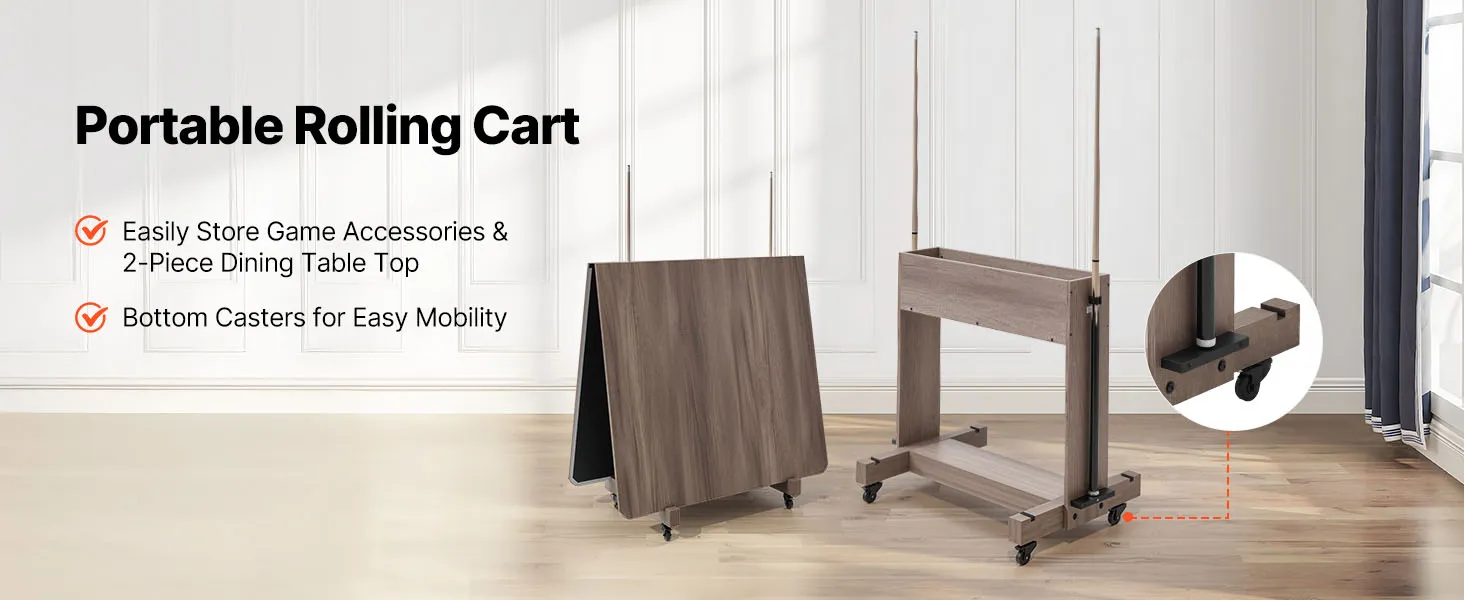 Switch between pool, ping pong, and dining in seconds. The reversible tabletop doubles as a tennis surface or folds onto the rolling caddy for instant pool action.