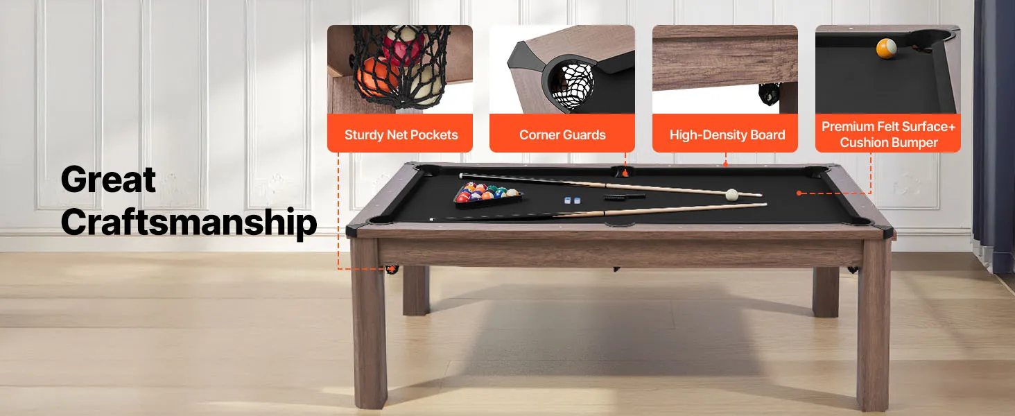 Strengthened pockets securely hold balls, while corners guard both the table and your walls. The high-quality felt surface and resilient cushion bumpers combine elegance with lasting durability.
