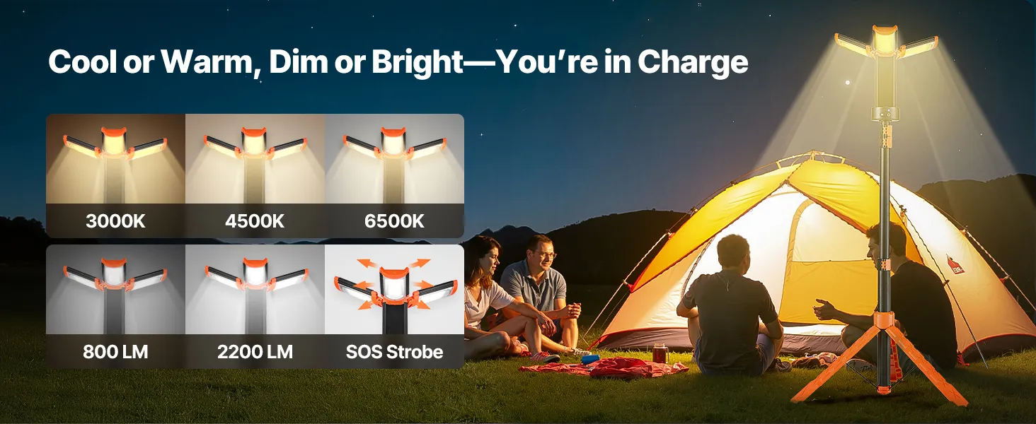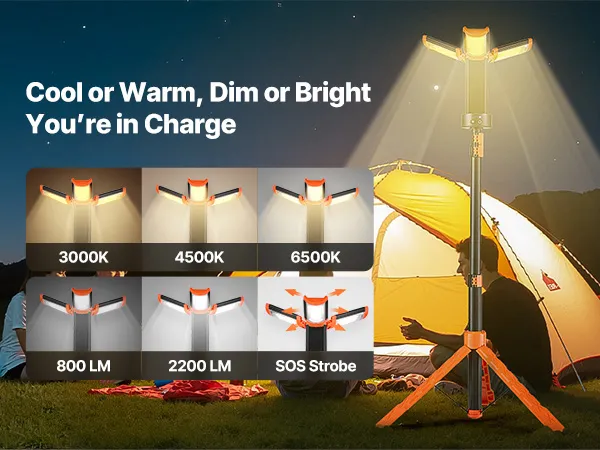 Our LED work light with stand supports switching from 3000K warm white to 6500K cool white, with brightness adjustable up to 2200 lumens. This helps meet various needs such as nighttime work, courtyard lighting, or creating a comfortable environment.
