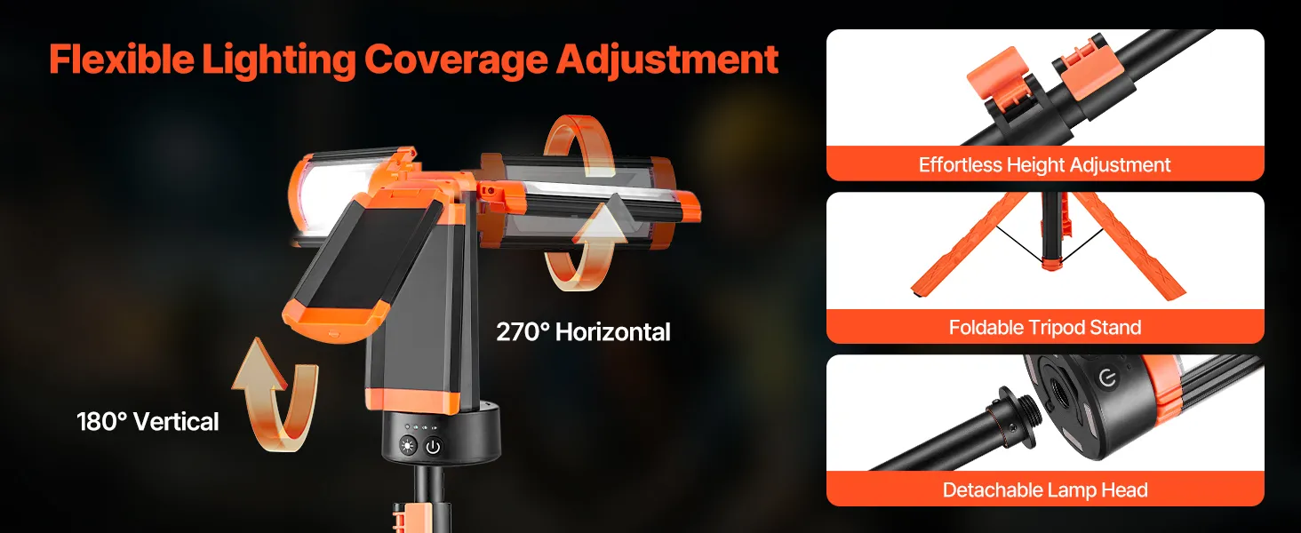 Each of the three lamp heads can be independently adjusted or detached. The rechargeable LED work light supports multiple usage methods, including handheld, wall-mounted, and fixed-point lighting, to flexibly suit different lighting scenarios.