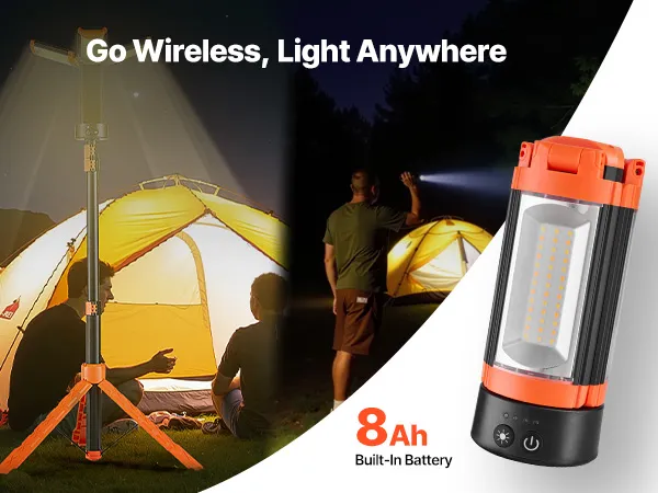 Equipped with a built-in 8 Ah battery, this portable work light enables long-time lighting without an external power source. It is suitable for outdoor construction, camping, power outage emergencies, and more.