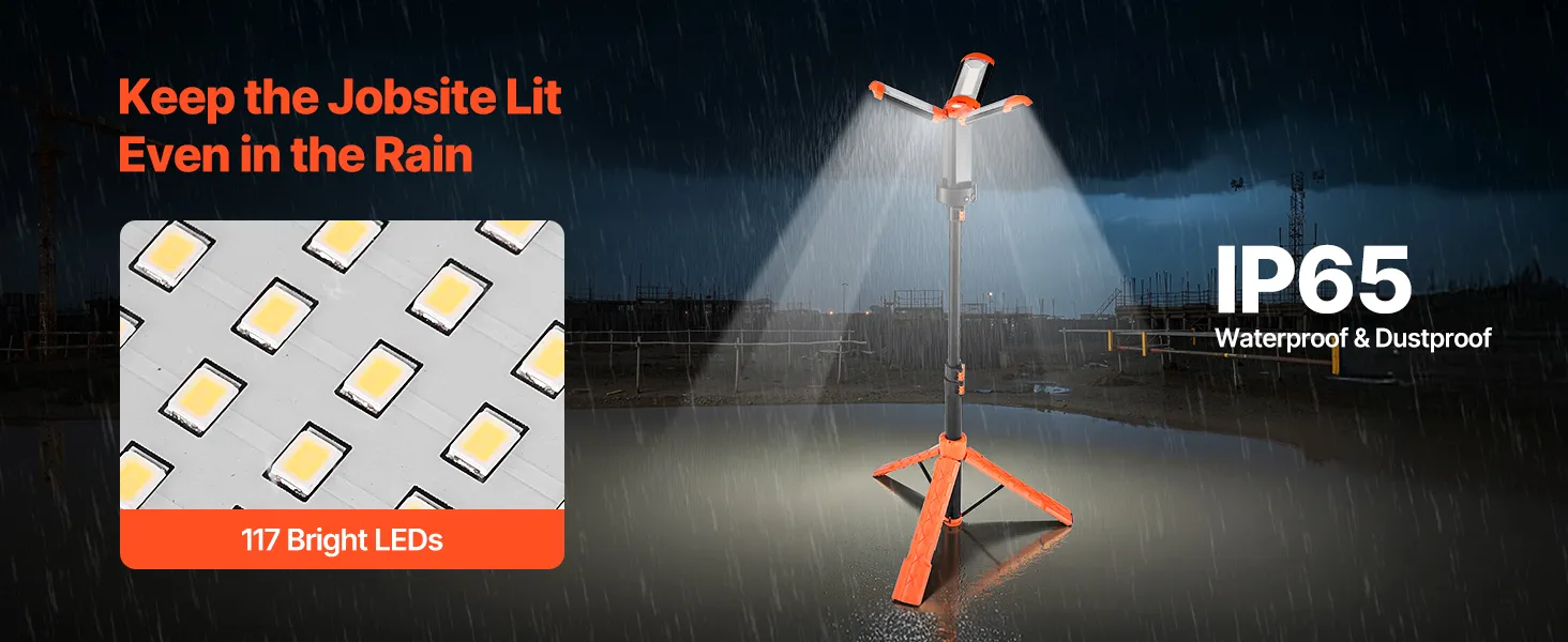 Our cordless work light features IP65-rated waterproof and dustproof structure. It is equipped with 117 high-brightness LED bulbs, providing stable and high-brightness operation even on rainy days.