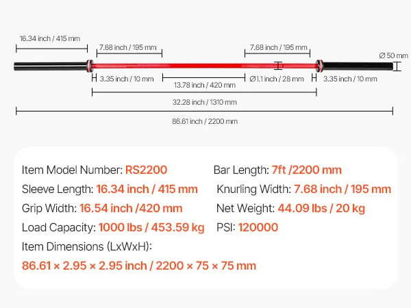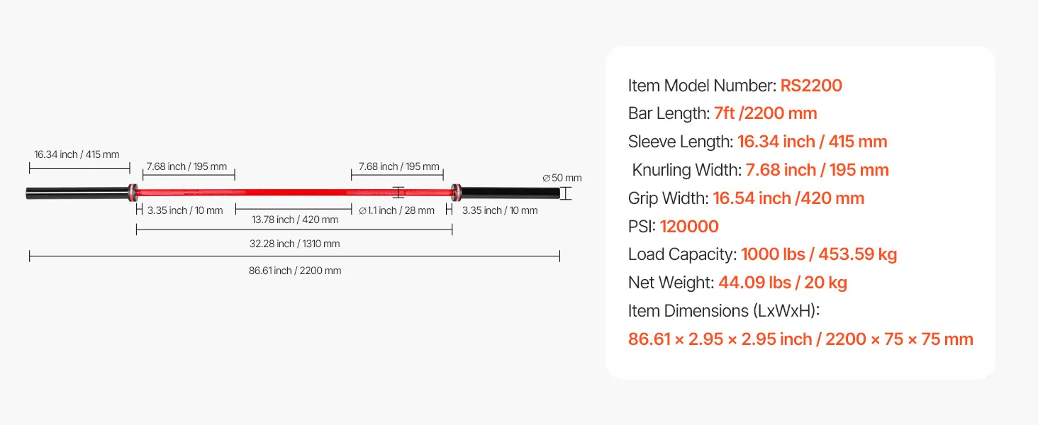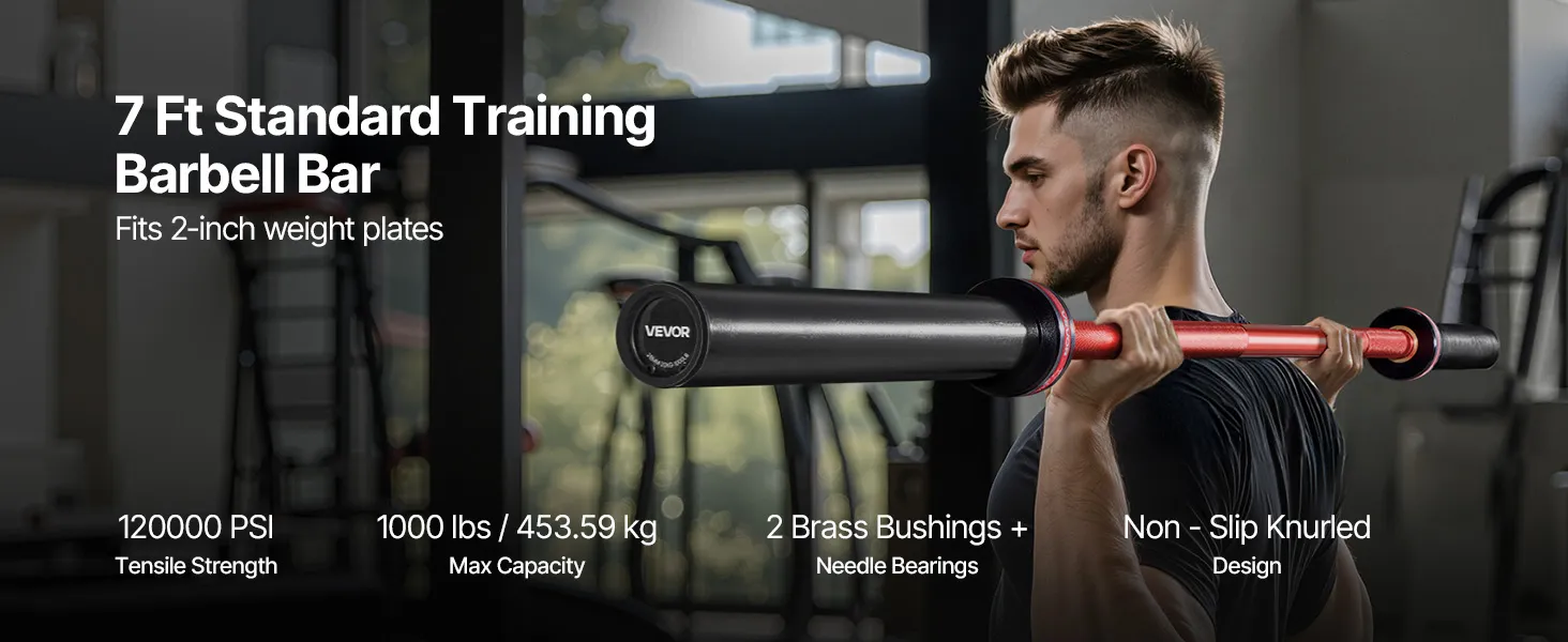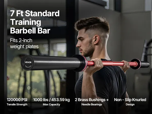 This bench press bar supports up to 1000 lbs / 453.59 kg with a tensile strength of 120,000 PSI. Featuring brass bushings, needle bearings, and diamond knurling, it ensures stability, secure grip, and comfortable handling for effective strength training.