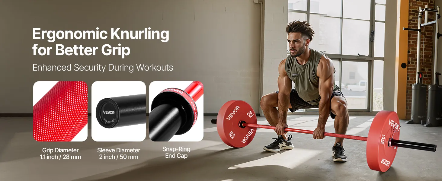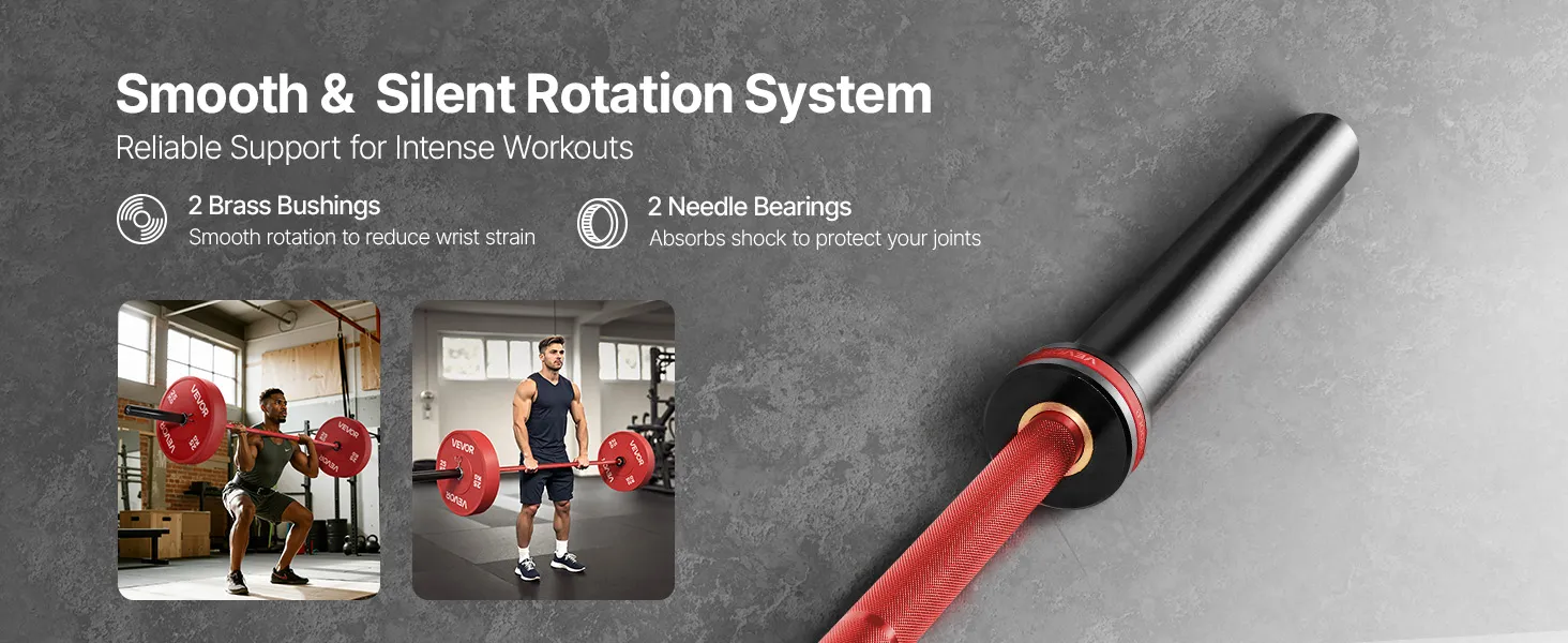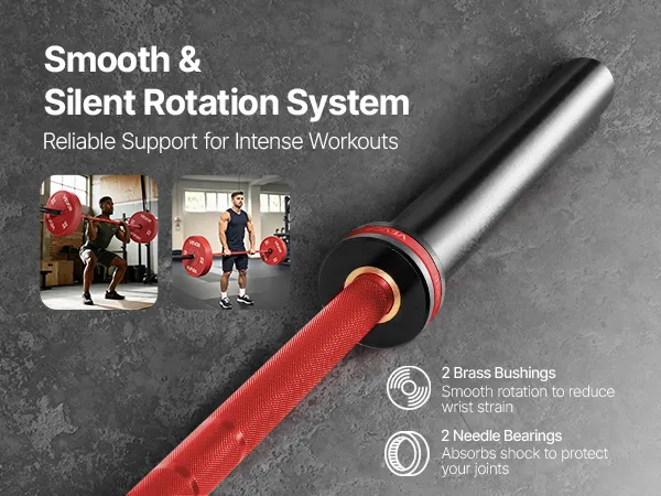 The strength training bar is equipped with 2 brass bushings and 2 needle bearings for smooth, quiet rotation. This reduces wrist and forearm strain, protects joints, and delivers consistent performance in bench press, rows, squats, and other heavy lifts.