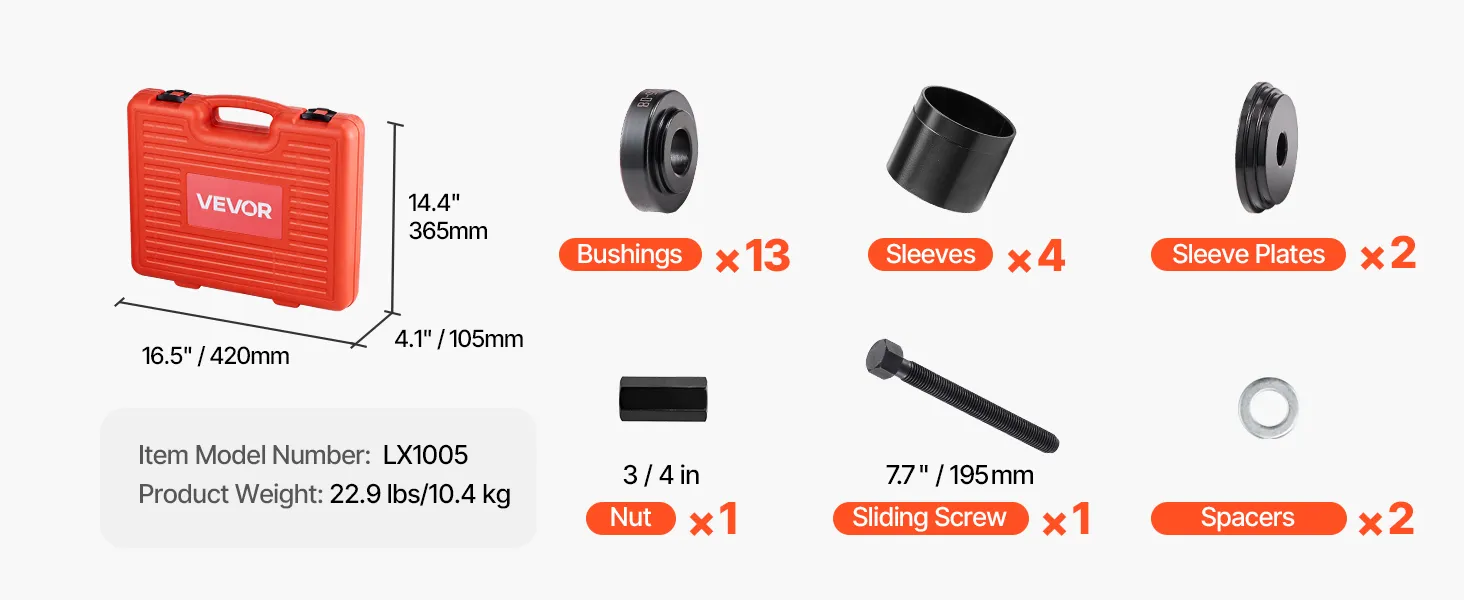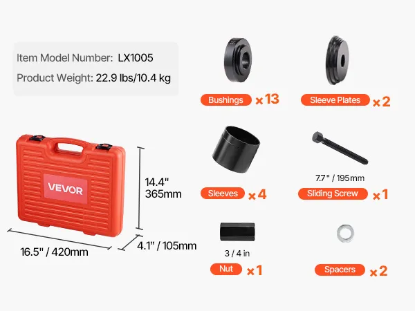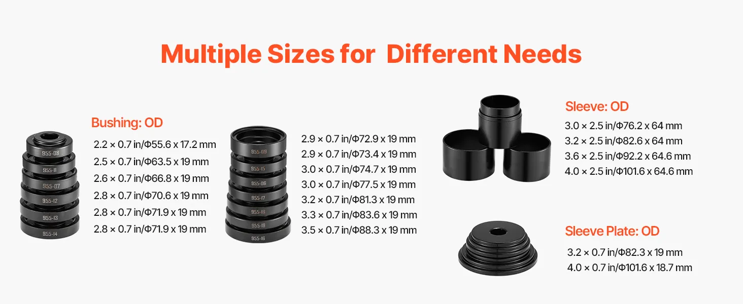 This wheel bearing press kit fits most FWD cars and light trucks. It includes 13 bushings, 4 sleeves, and 2 plates for most bearing sizes. Easily assemble to detach or install bearings. It is made of heavy-duty, rust-resistant steel that withstands impacts and oil exposure for long-lasting use.