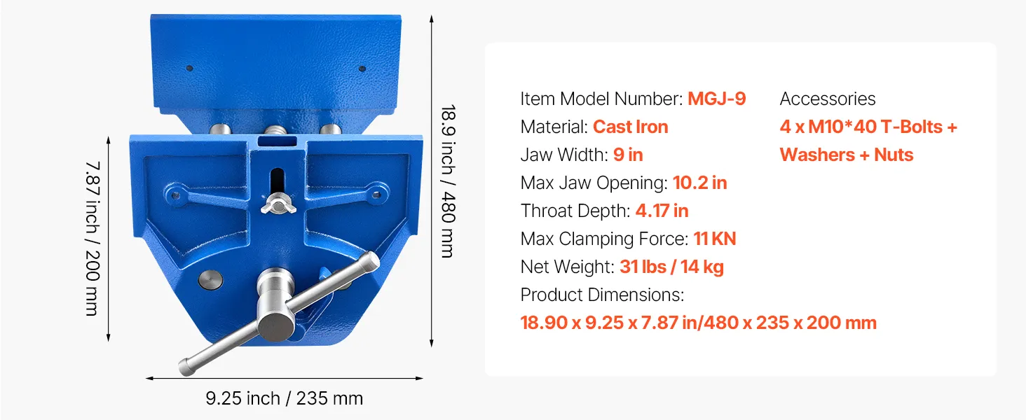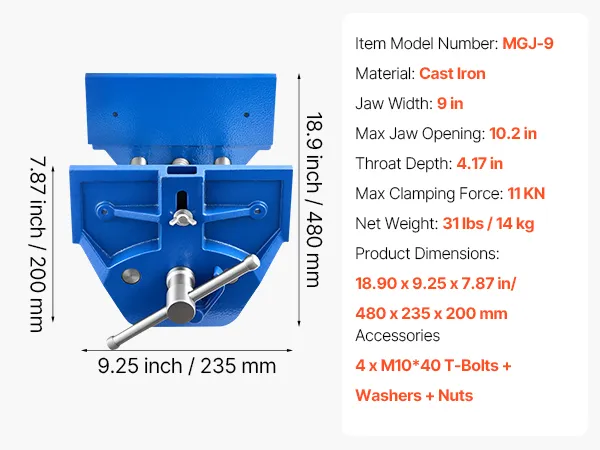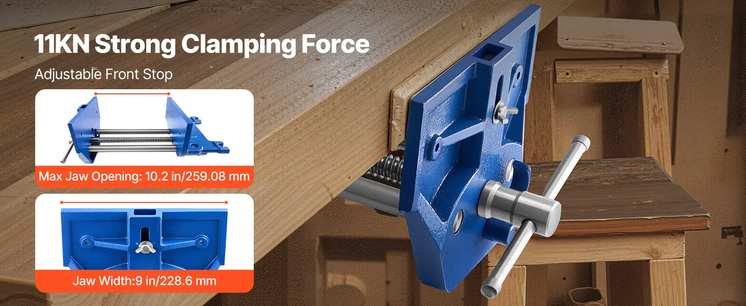 This wood vise delivers 11KN clamping force to keep your workpiece stable and secure. The adjustable stop block allows easy positioning, while the maximum jaw opening and width accommodate materials of different sizes.
