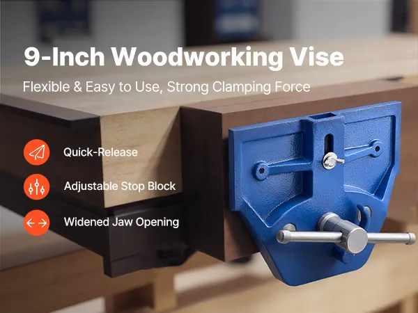 The wood bench vise features widened jaw opening that firmly grip various wood pieces with a strong clamping force. A quick-release function allows fast operation, while the adjustable stop block adapts to different work scenarios.