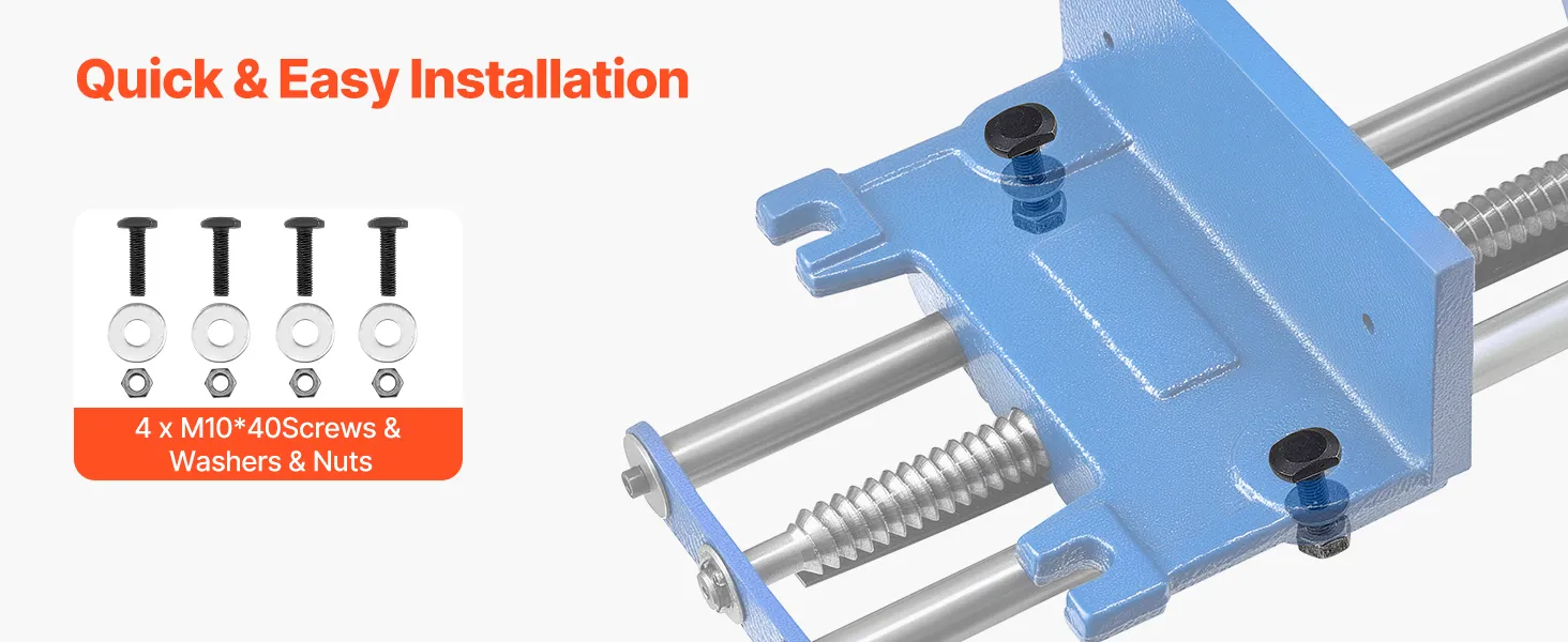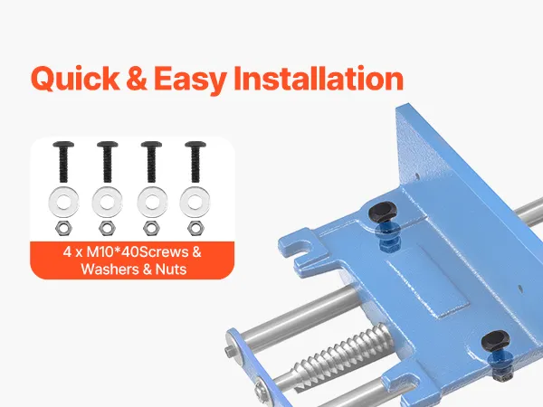 Designed for easy setup, the woodworking bench vise includes 4 set of bolts, washers and nuts, enabling you to mount it securely to your workbench effortlessly. Convenient and practical for fast assembly.
