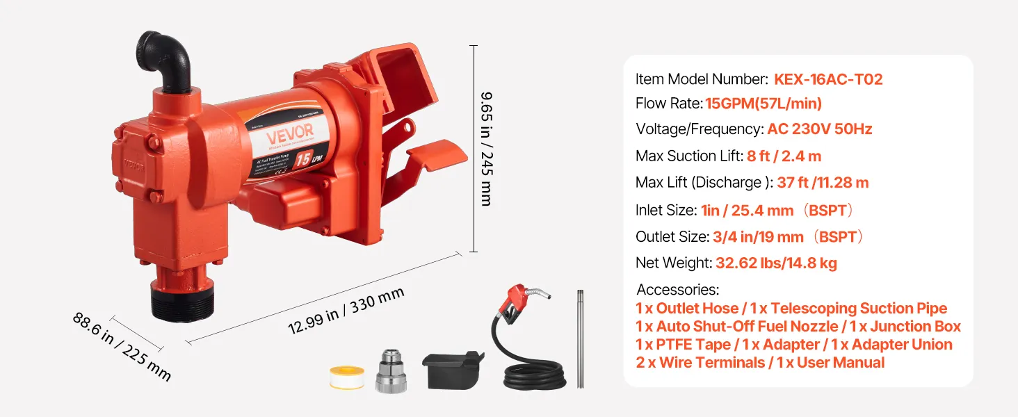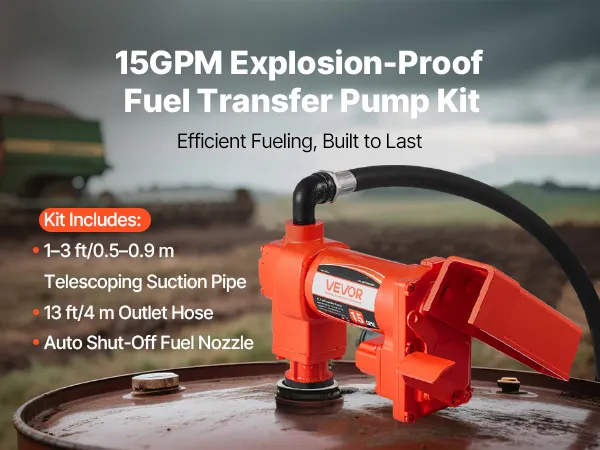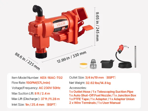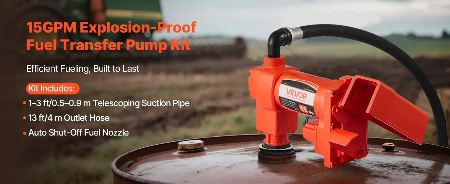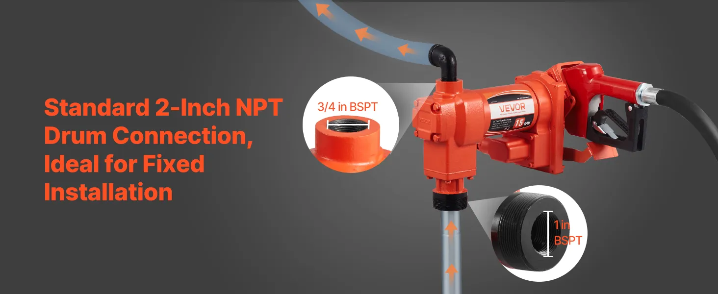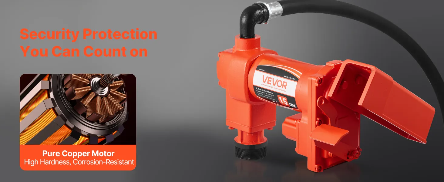 Transfer fuel fast with a 15 GPM (57 L/min) max flow rate, an 8 ft (2.4 m) max suction, and a 37 ft (11.28 m) max lift. With a pure copper motor, cast iron pump head, and built-in overheat protection, this pump delivers reliable performance and secure operation for diesel, kerosene, and biodiesel.