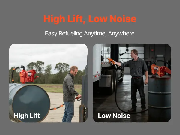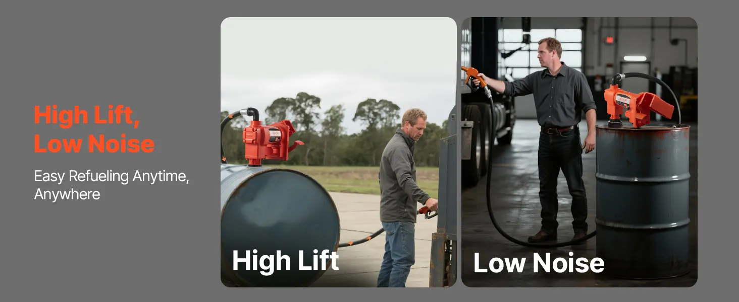 Features an impressive 37 ft (11.28 m) max lift for fueling at elevated points while keeping noise to a minimum. This diesel fuel transfer pump is suitable for night operations or noise-sensitive environments, delivering fuel efficiently without causing disruptions.