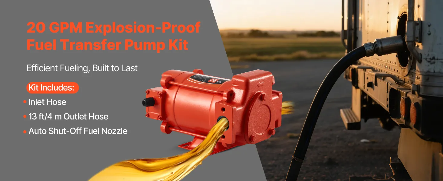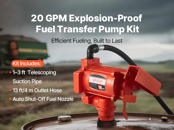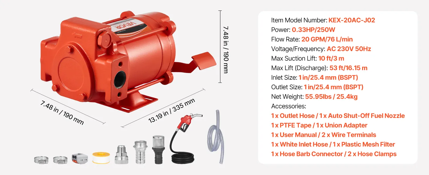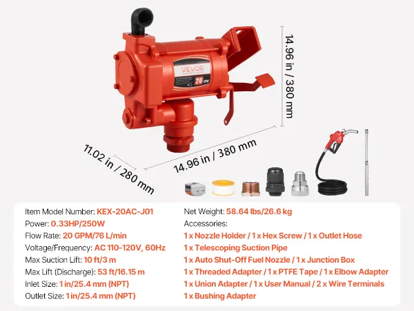 Transfer fuel fast with a 20 GPM (76 L/min) max flow rate, a 10 ft (3 m) suction lift, and a 53 ft (16.15 m) max lift. With a pure copper motor, cast iron pump head, and built-in overheat protection, this pump delivers reliable performance and secure operation for diesel, kerosene, and biodiesel.