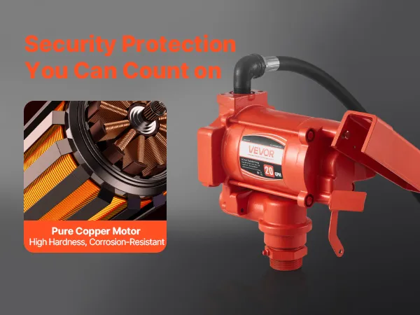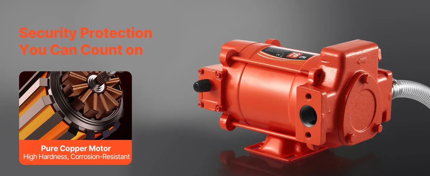 Our electric oil transfer pump is designed with a portable handle for easy transport and storage, a copper motor for durability, a reinforced cast iron housing for impact and corrosion resistance, and a waterproof power switch with multi-layer security protection for peace of mind operation.