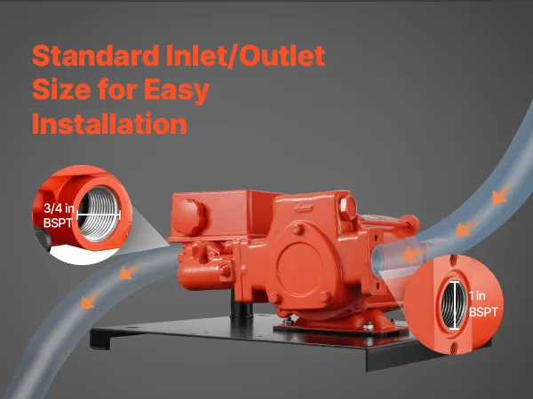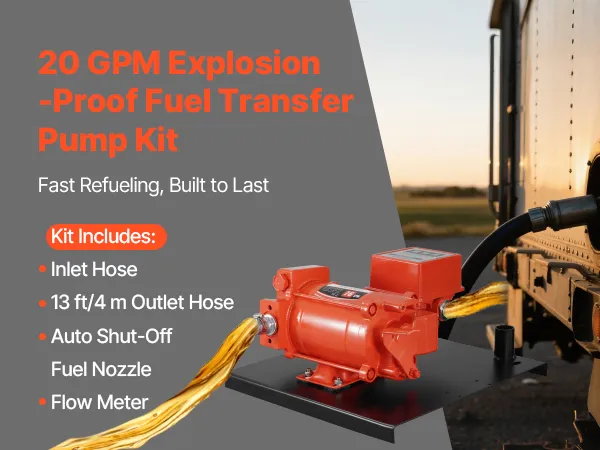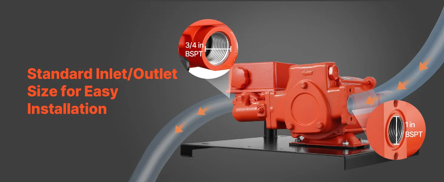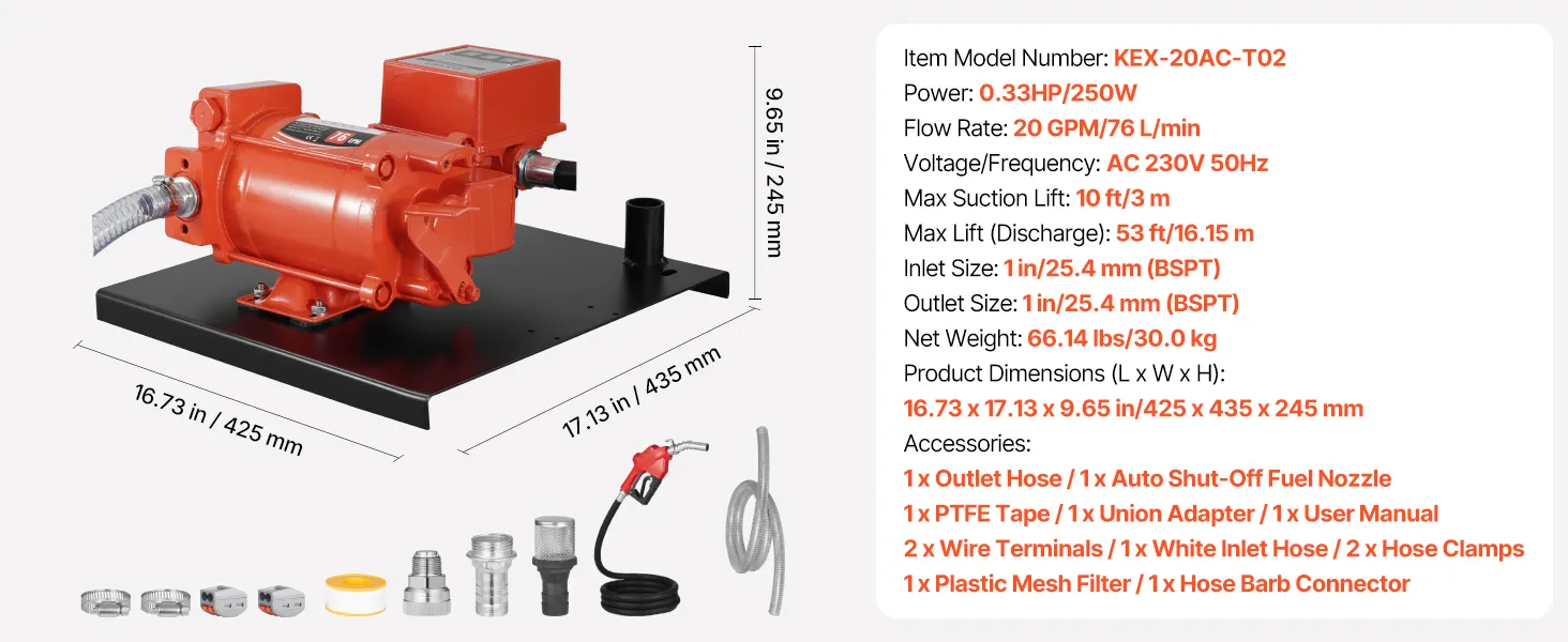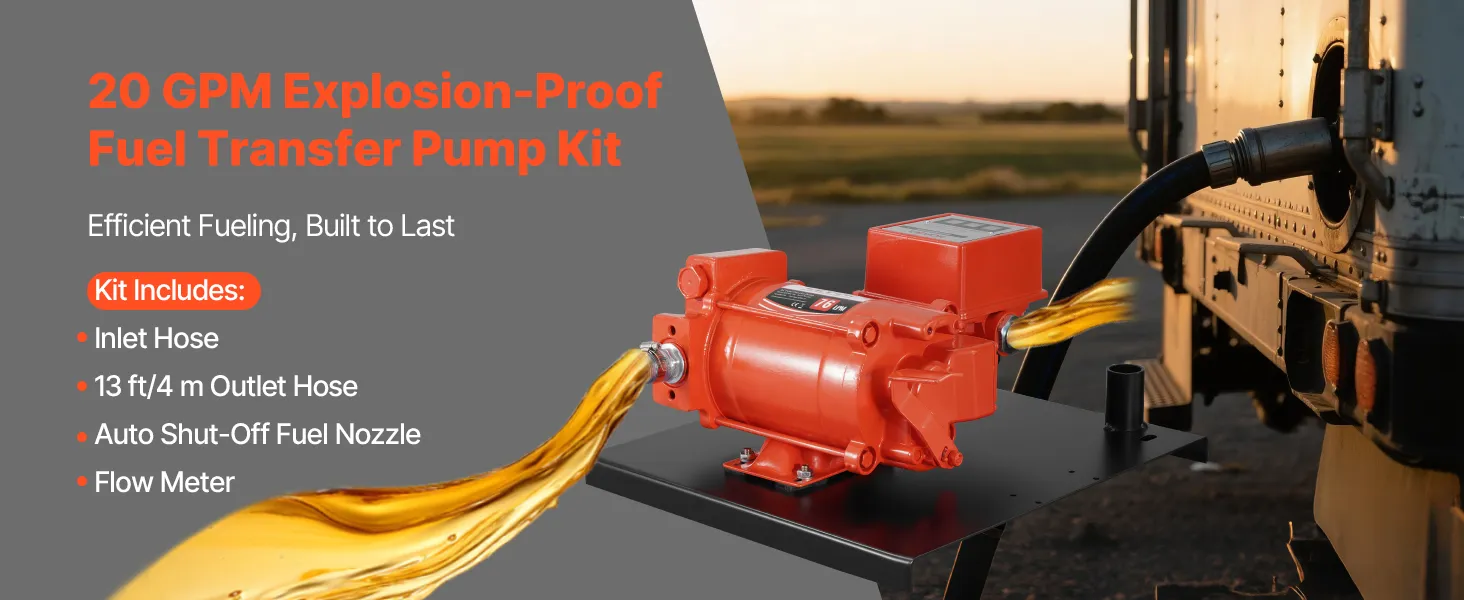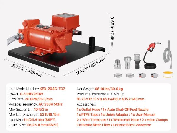 • 20 GPM Fast Fuel Transfer: This fuel transfer pump delivers 20 GPM (76 L/min) max flow rate, 10 ft (3 m) max suction lift, and 53 ft (16.15 m) max lift. Ideal for fueling heavy machinery, large fuel tanks, and equipment at construction sites