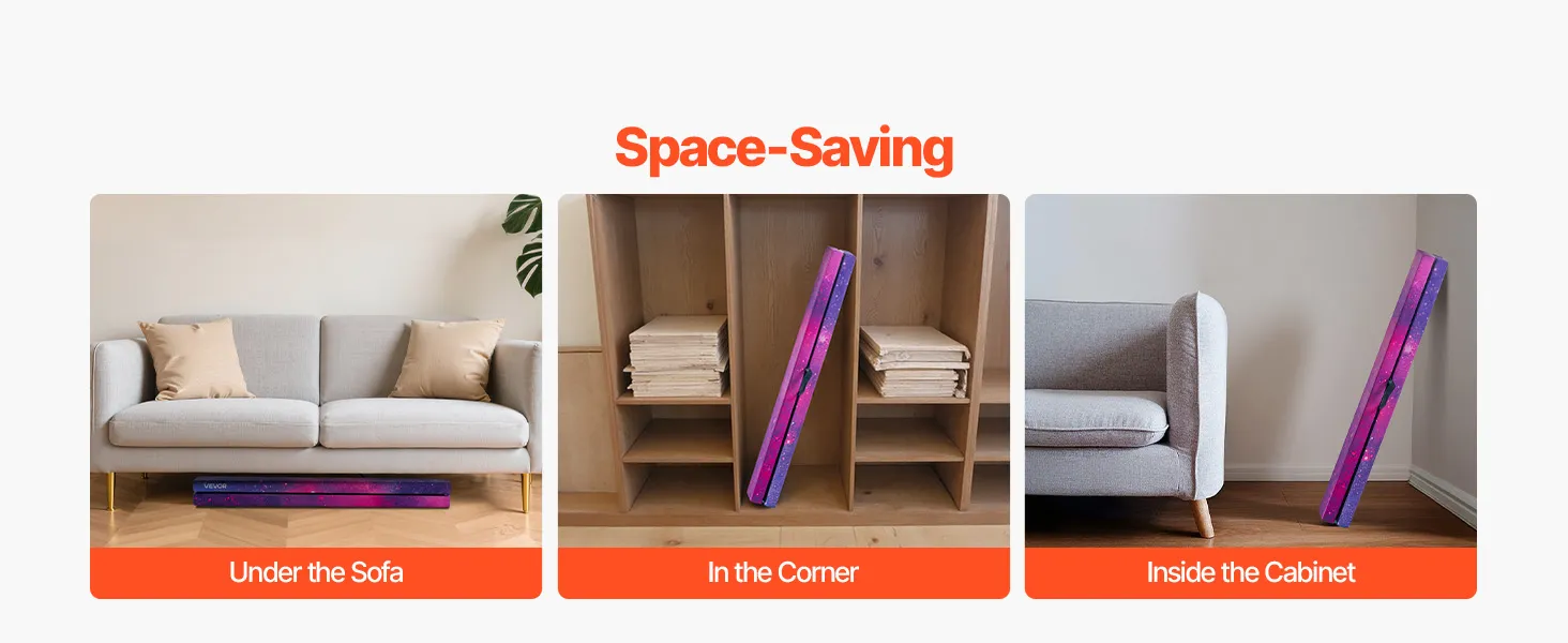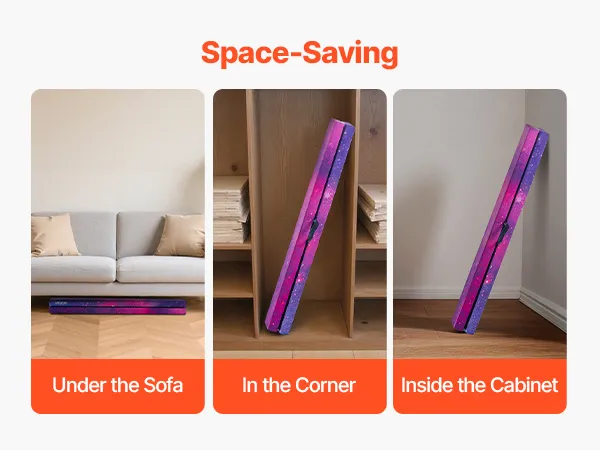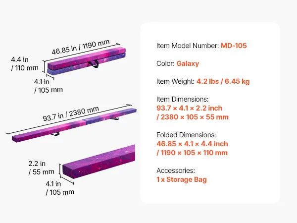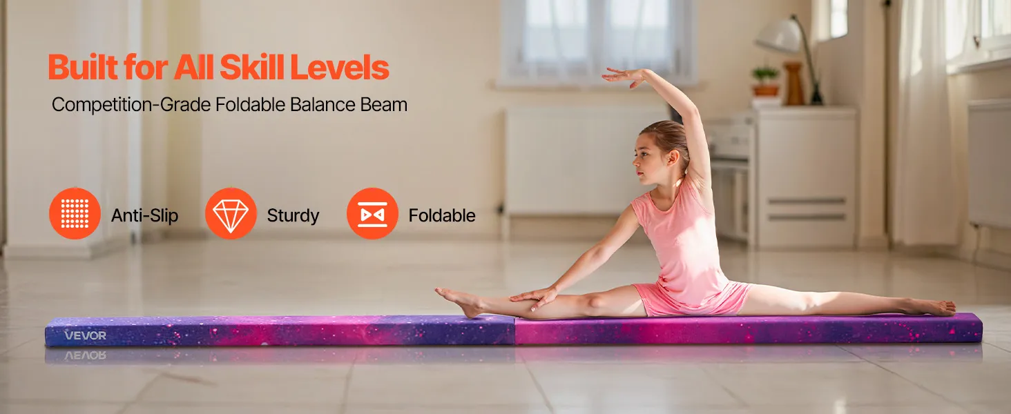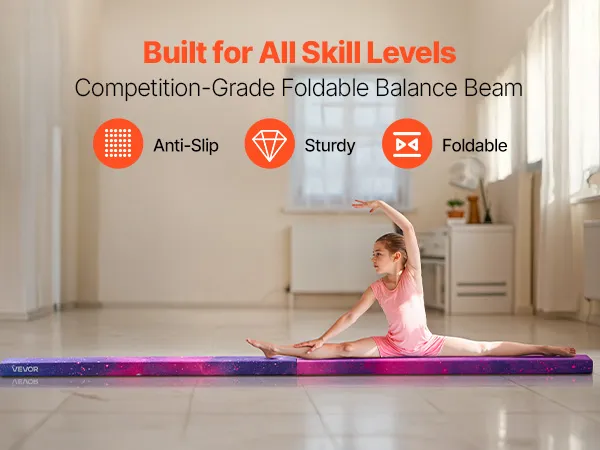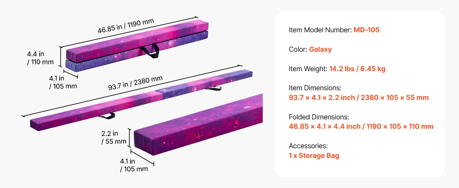 VEVOR 238cm Folding Gymnastics Balance Beam for Kids, Wood Core, Non-Slip Mat, 136.1kg Capacity, Carry Bag – Galaxy