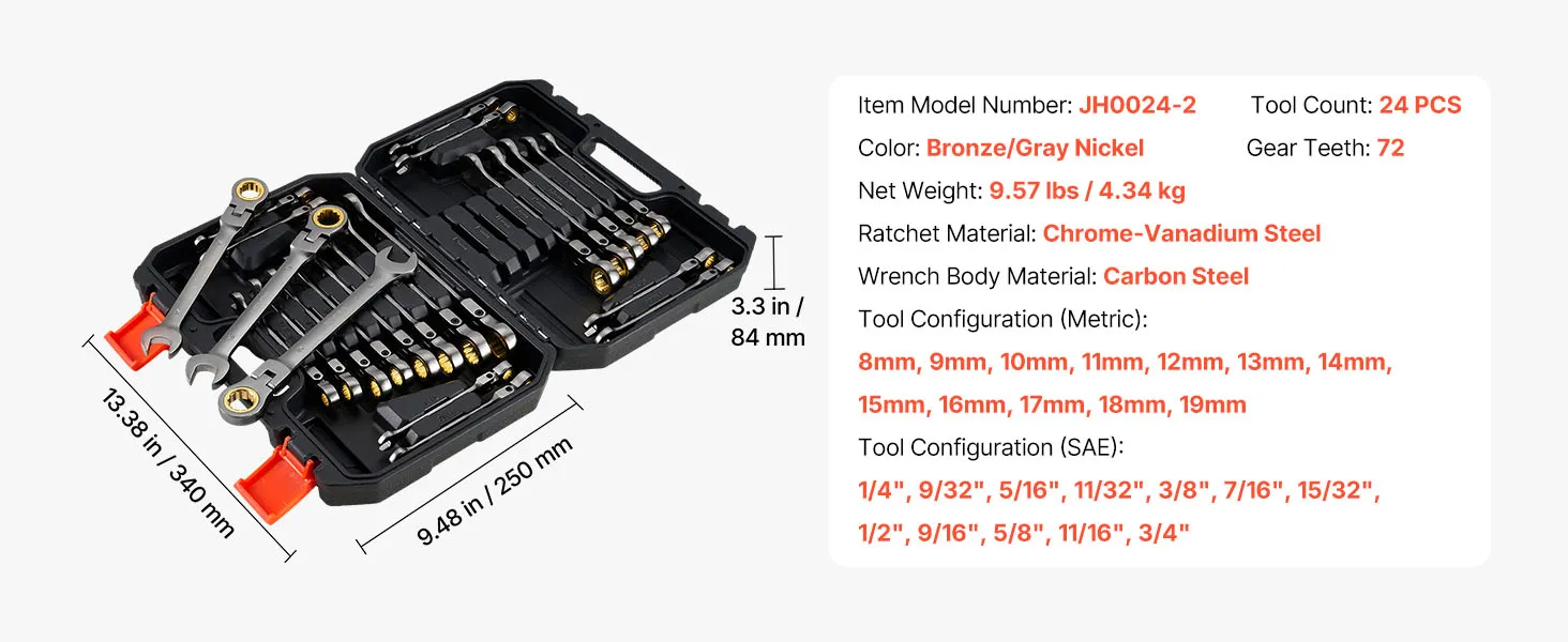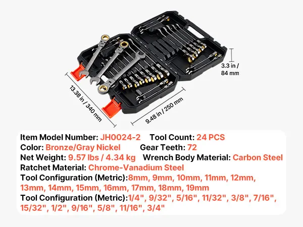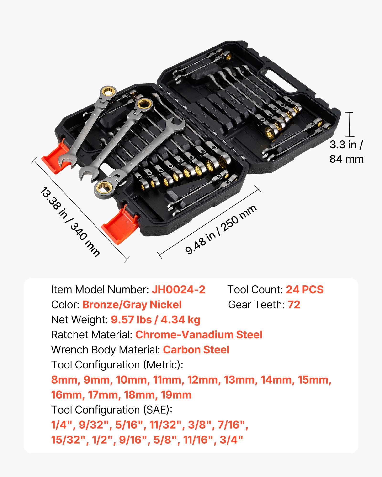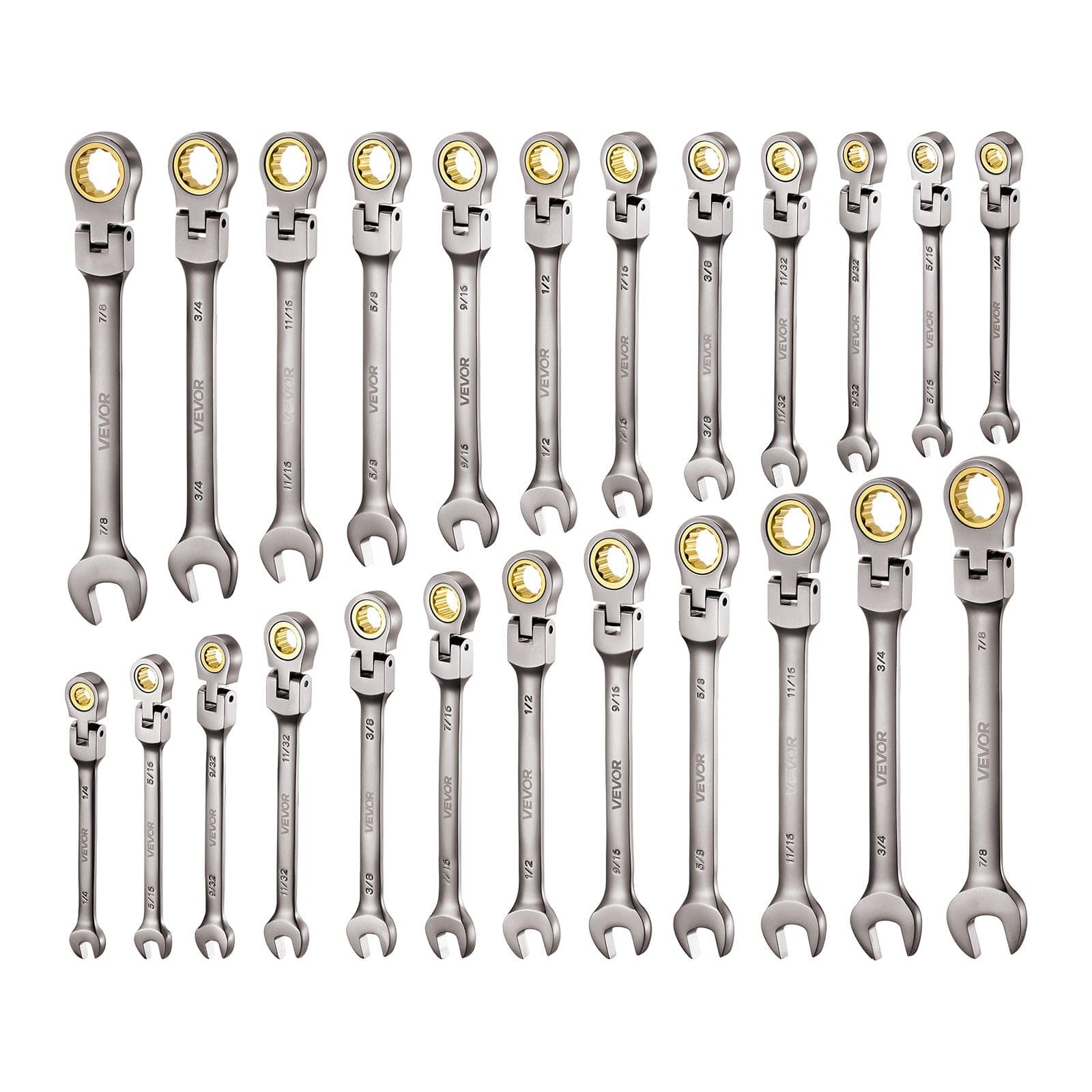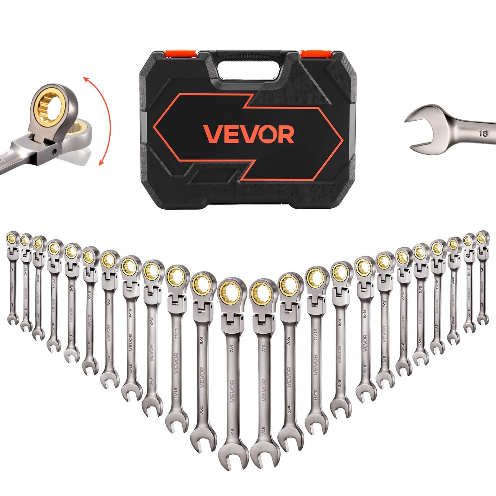 VEVOR Flex-Head Ratcheting Wrench Set, 24-Piece SAE and Metric, 72 Teeth, Cr-V Steel Ratchet Flexible Combination Wrench Set with Storage Case, for General Household, Automotive Repairs, Gray Nickel